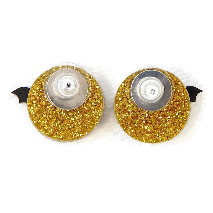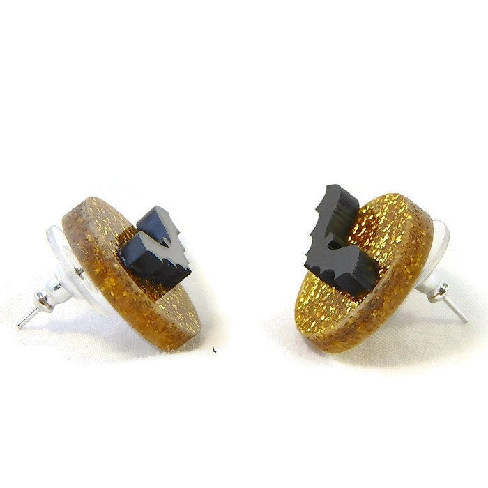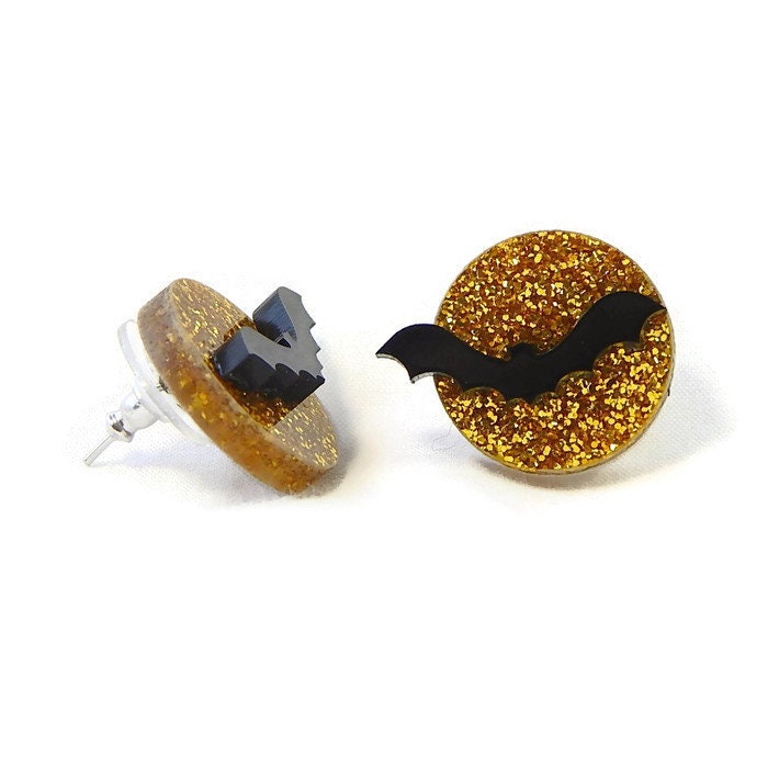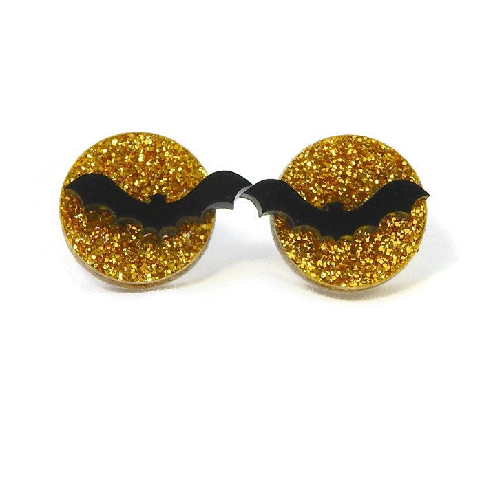 These moon and black bats earrings are creepy and cute. Laser cut gold glitter acrylic moons are adorned with black acrylic bats. The earrings measure approximately 18 mm x 23 mm (.70" in x .90 in) and are backed with hypoallergenic nickel free earring backs for sensitive ears. Earrings come with earring stabilizing backs to keep the earring snug to your ear.