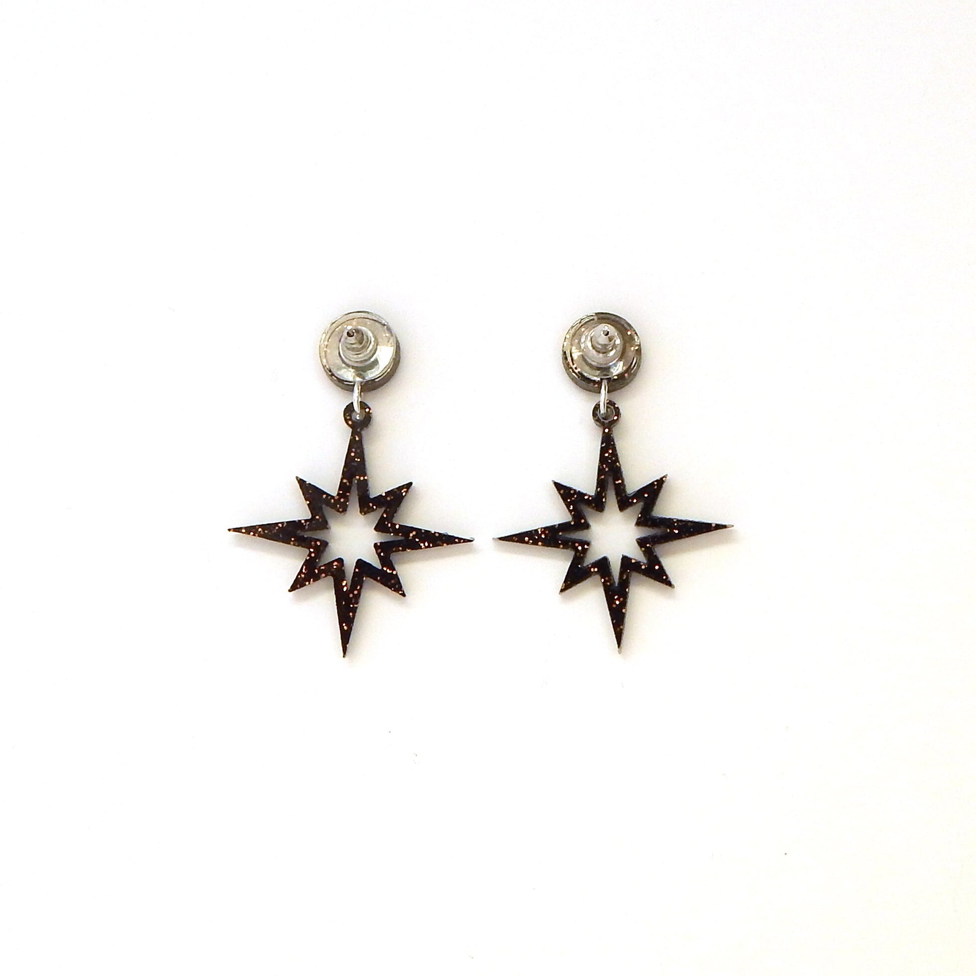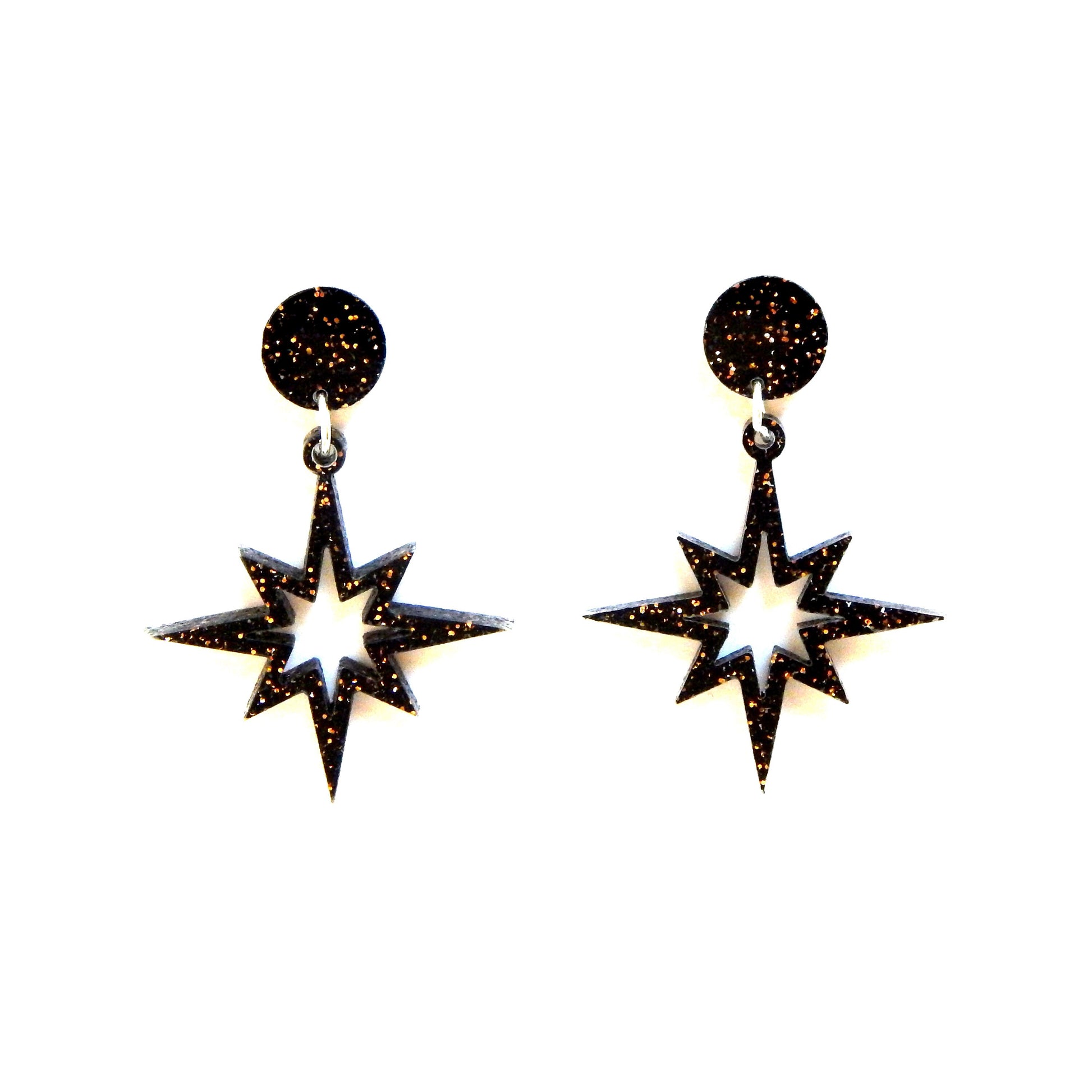 Flaunt your retro style with these 1950s inspired atomic starburst earrings. These mid century inspired star dangle earrings will add some vintage flair to any outfit, day or night. Made of black and gold glitter acrylic to make you sparkle. The laser cut design is so lightweight you will forget you are wearing them and they are nickel free so no more itchy, irritated ears. The comfort clutch style earring backs keep the earring snug to your ear so they don't pull or droop.
