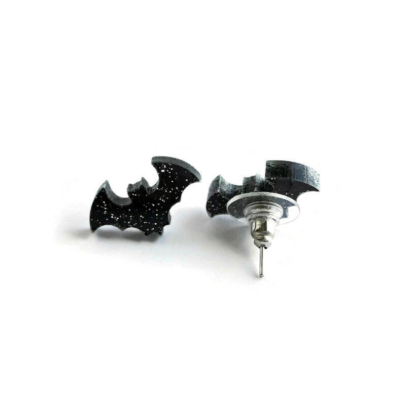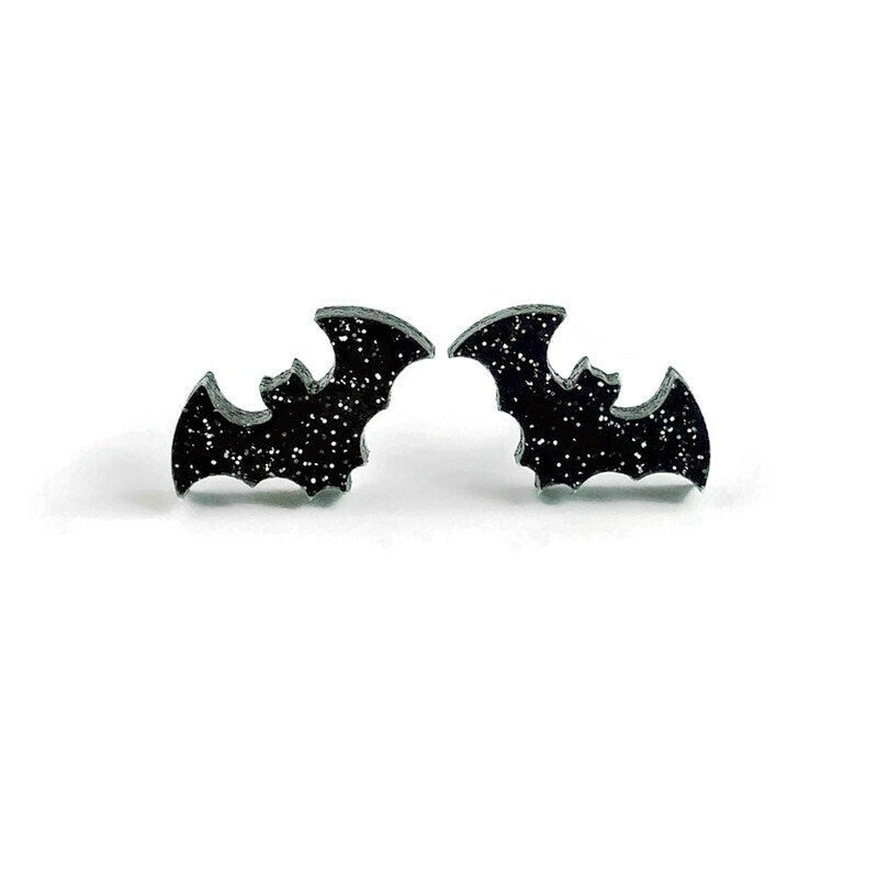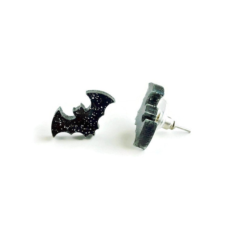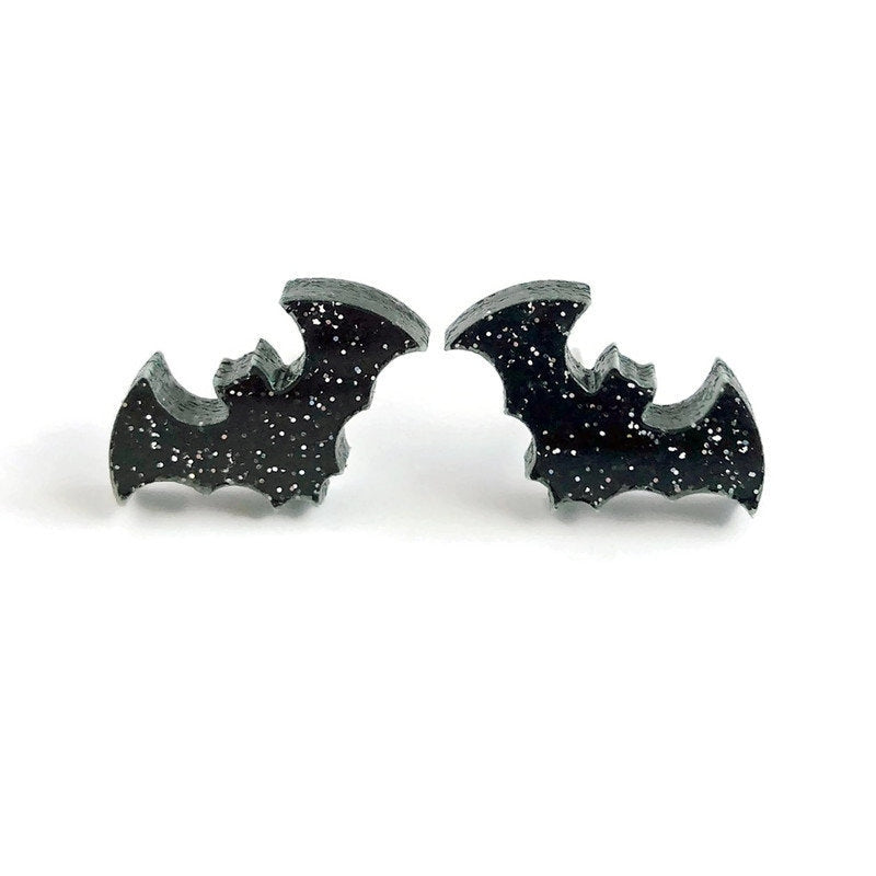 Fun and spooky these black bat earrings are the perfect accessory for Halloween. Made of laser cut black acrylic with silver sparkles, these earrings are lightweight and comfortable.
