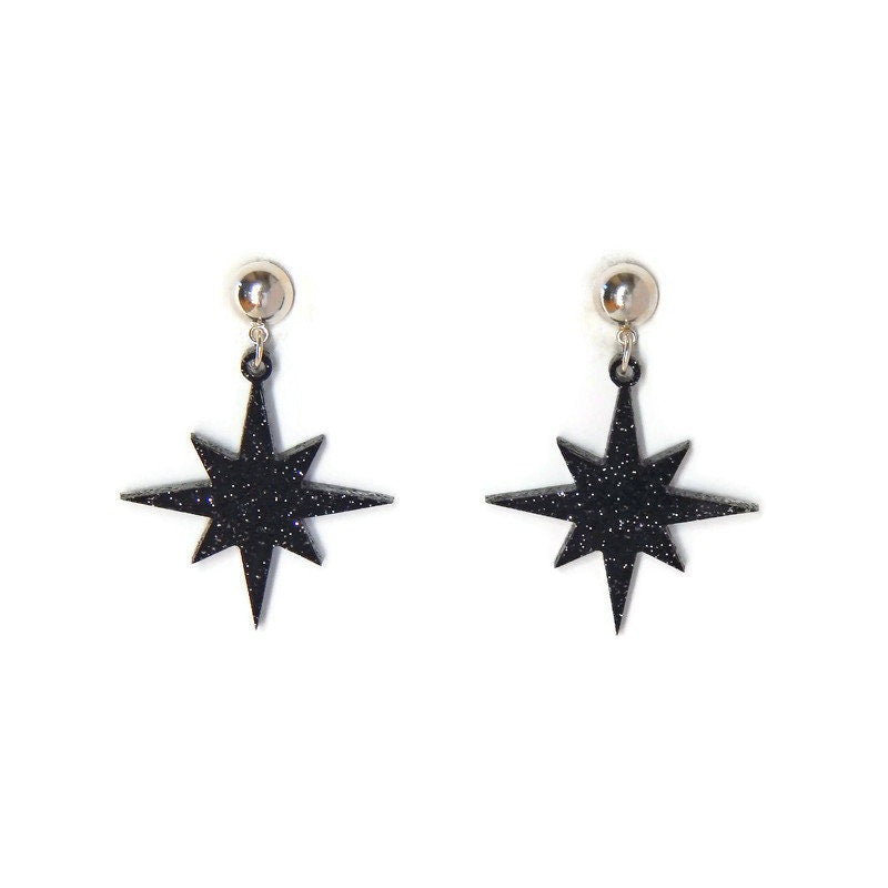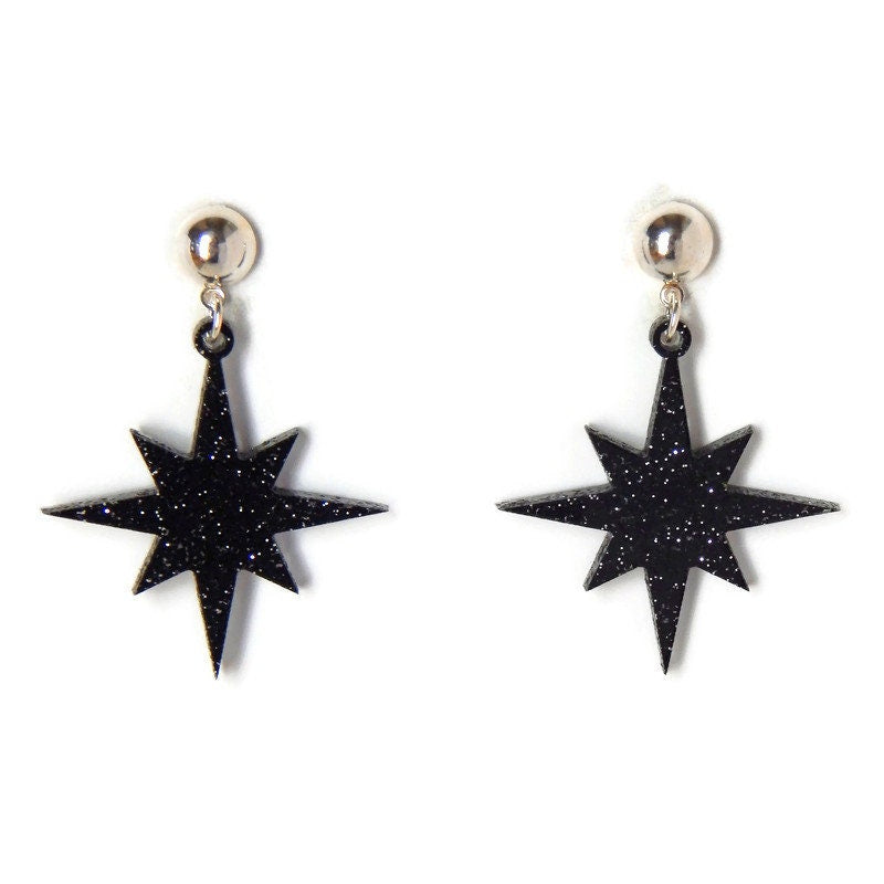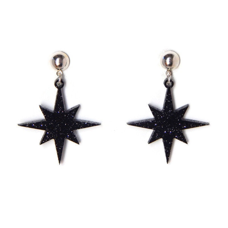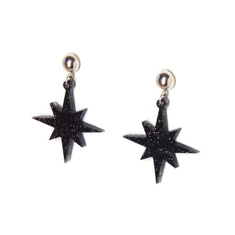 Flaunt your retro style with these 1950s inspired atomic starburst earrings. These mid century inspired star dangle earrings will add some vintage flair to any outfit, day or night. Made of black and silver glitter acrylic sure to get attention. The laser cut design is so lightweight you will forget you are wearing them. The comfort clutch style earring backs keep the earring snug to your ear so they don't pull or droop.