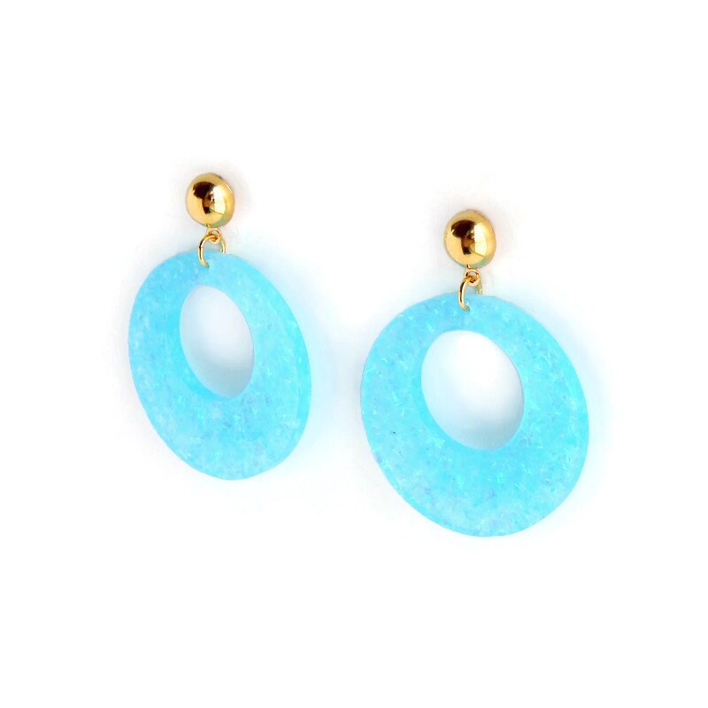 These dangling light blue glitter hoop earrings are both retro and timeless. Made from lightweight acrylic for maximum comfort and style without the added weight. This classic design will add some vintage flair to any outfit, day or night. The blue glitter finish gives these earrings lots of sparkle and visibility. Comes with gold or silver colored half ball studs, choose your color from the drop down menu.