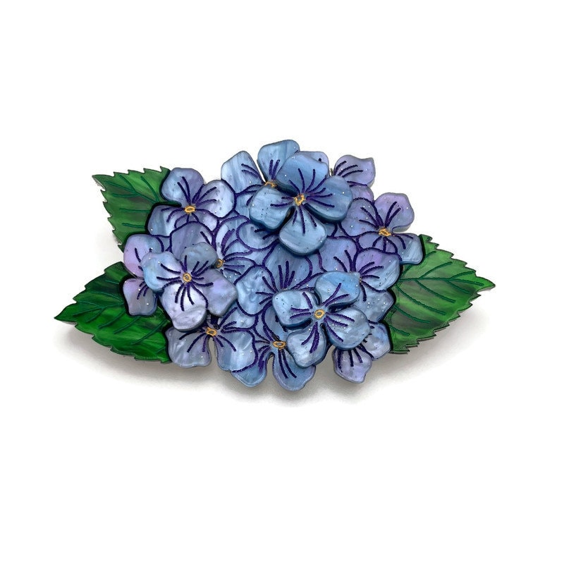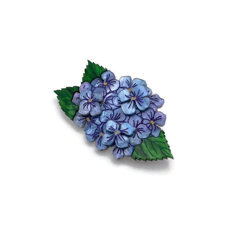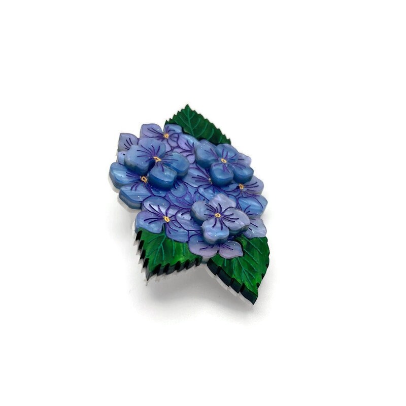Liven up your wardrobe with this sweet hydrangea brooch. Laser cut from a blue/lavender and green marbled acrylic, this floral brooch will add fresh spring vibes to any outfit. The brooch measures approximately 75 mm (about 2.95") x 45 mm (about 1.79") and is backed with a pin back.