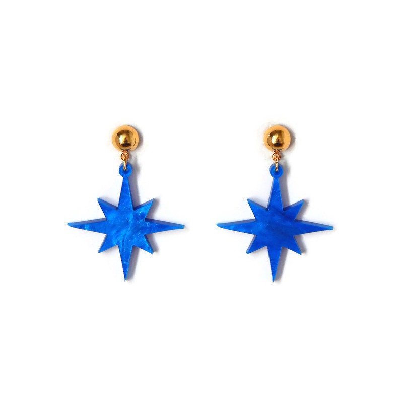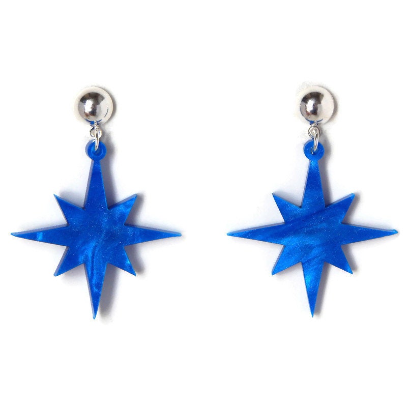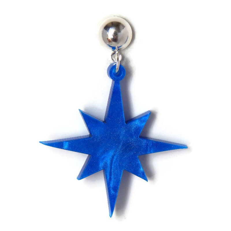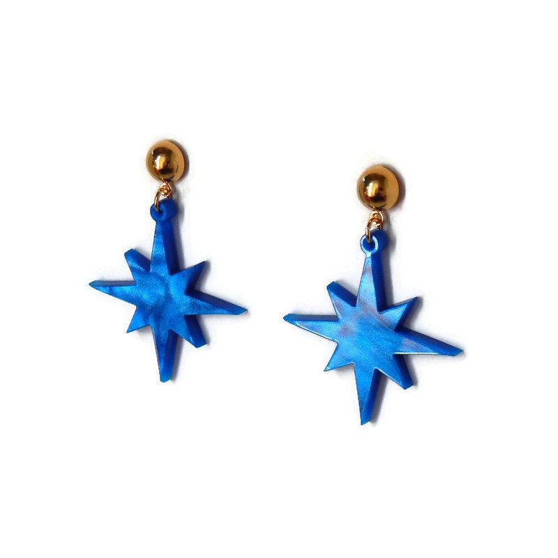 Flaunt your retro style with these 1950s inspired atomic starburst earrings. These mid century inspired star dangle earrings will add some vintage flair to any outfit, day or night. Made of blue pearl acrylic sure to get attention. The laser cut design is so lightweight you will forget you are wearing them and hangs from your choice of a gold or silver tone half ball stud. The comfort clutch style earring backs keep the earring snug to your ear so they don't pull or droop.