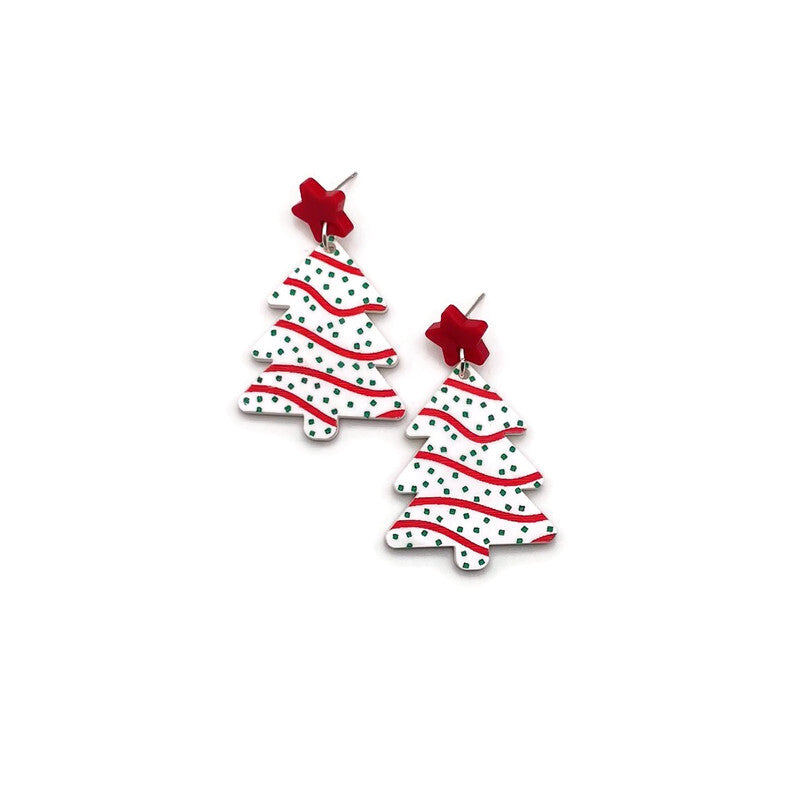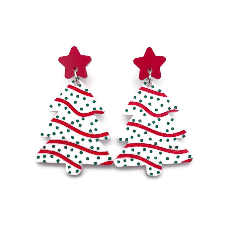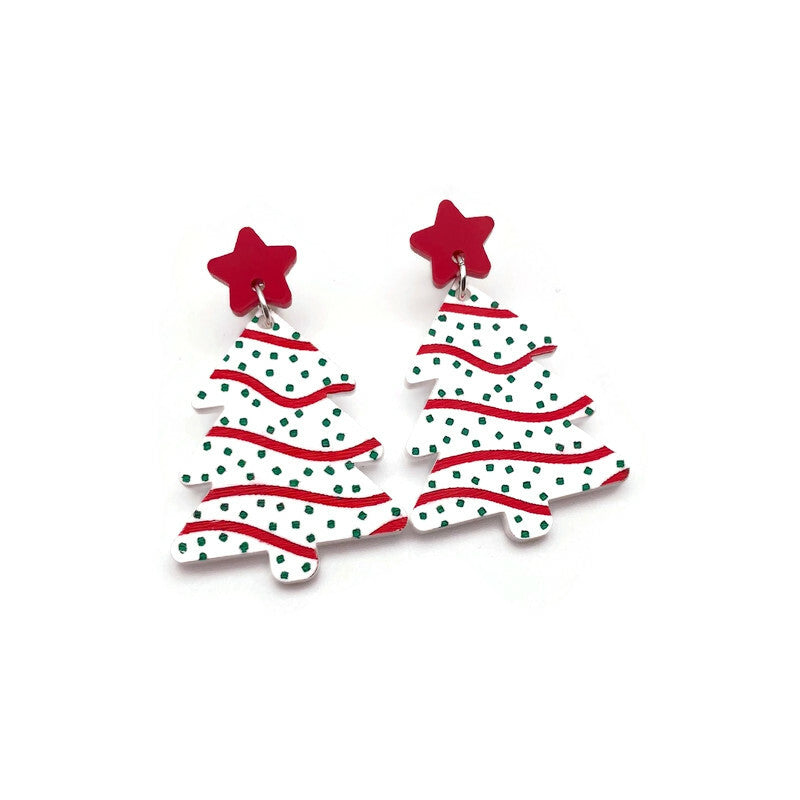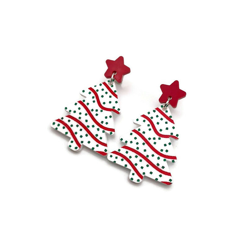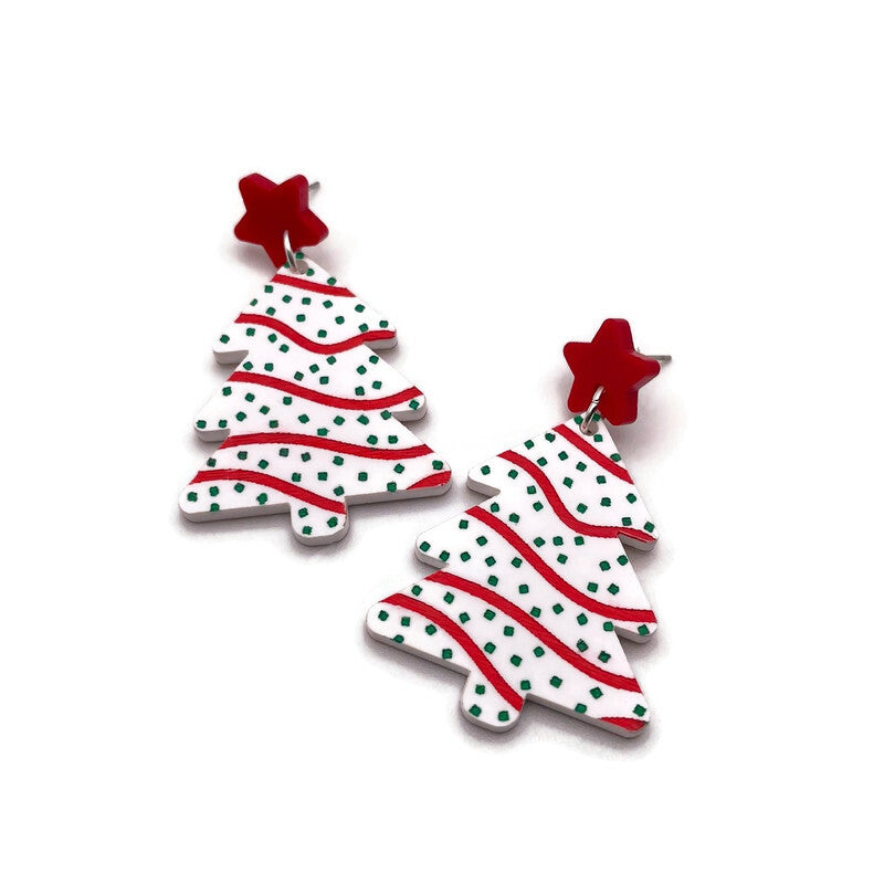 Embrace the Holiday spirit with these vintage inspired Christmas tree snack cake earrings. Crafted from laser cut acrylic, these festive earrings combine nostalgic charm and modern style. Hanging from red acrylic stars, white acrylic trees are engraved and embellished with hand painted details to look just like your favorite holiday themed snack cake.
