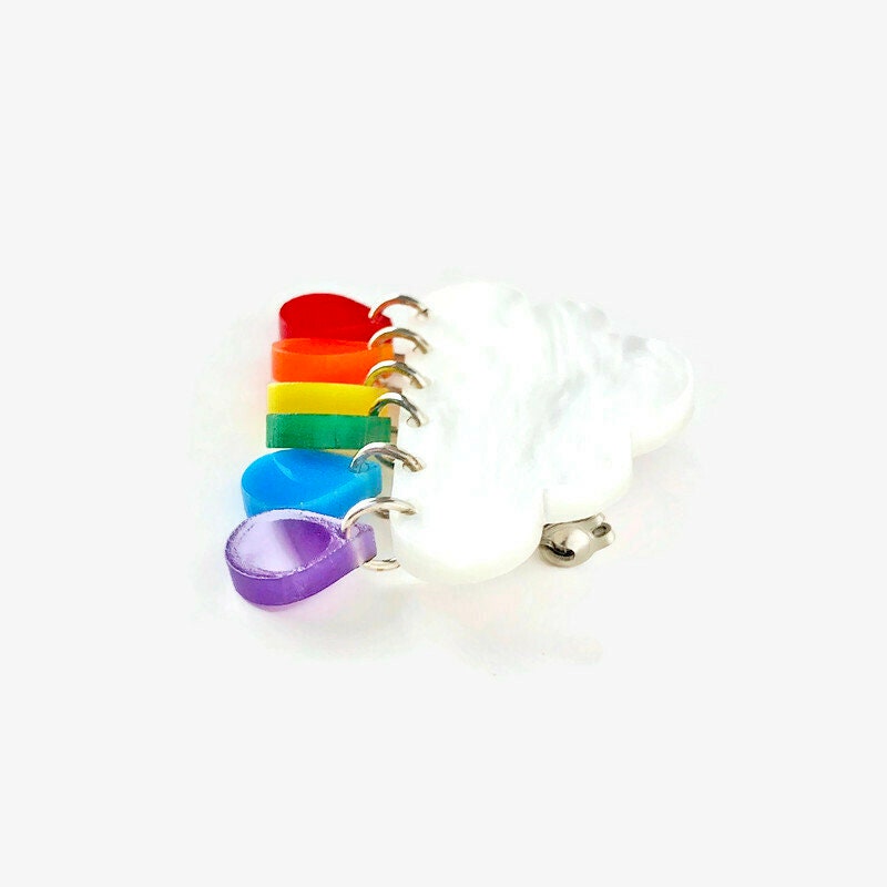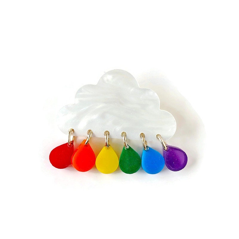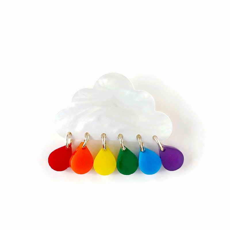 Rainbows are the universal sign of hope and this colorful rainbow rain and cloud brooch is sure to make you feel hopeful. Perfect to brighten up a dreary day. Made of laser cut acrylic in white pearl and rainbow colored raindrops.