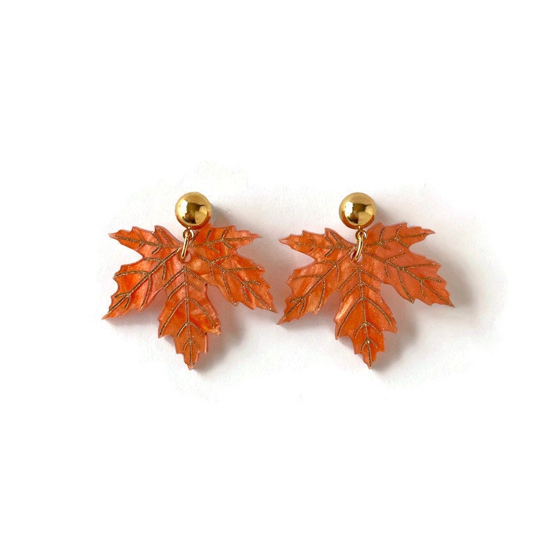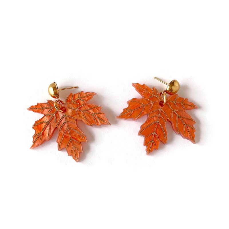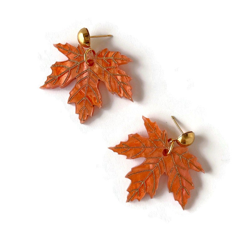 These maple leaf earrings are designed with stunning orangey copper marble acrylic to shine and sparkle as they catch the light.