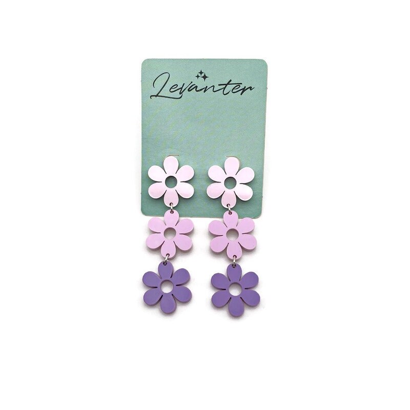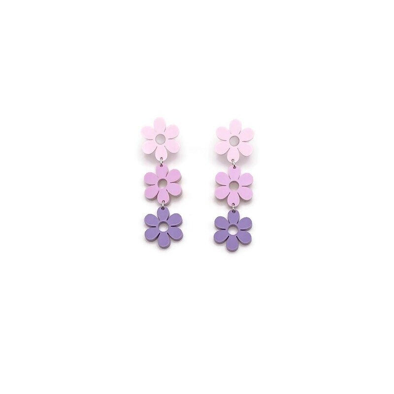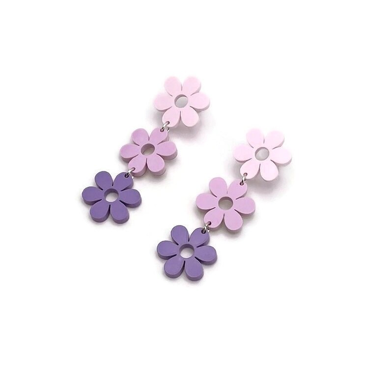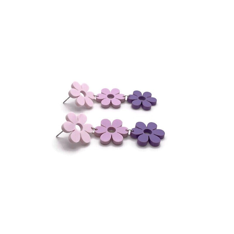 These stylish, lightweight stacked daisy dangle earrings are sure to be a showstopper. Ready for any occasion and perfect for summer, these retro style flower earrings have a modern feel that’s all their own. Three daisies are laser cut from acrylic in light pink, lilac and purple and lovingly hand assembled to make a statement without weighing you down.