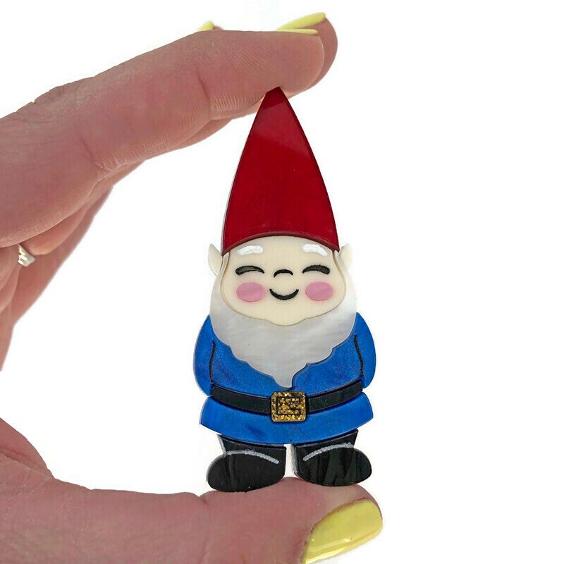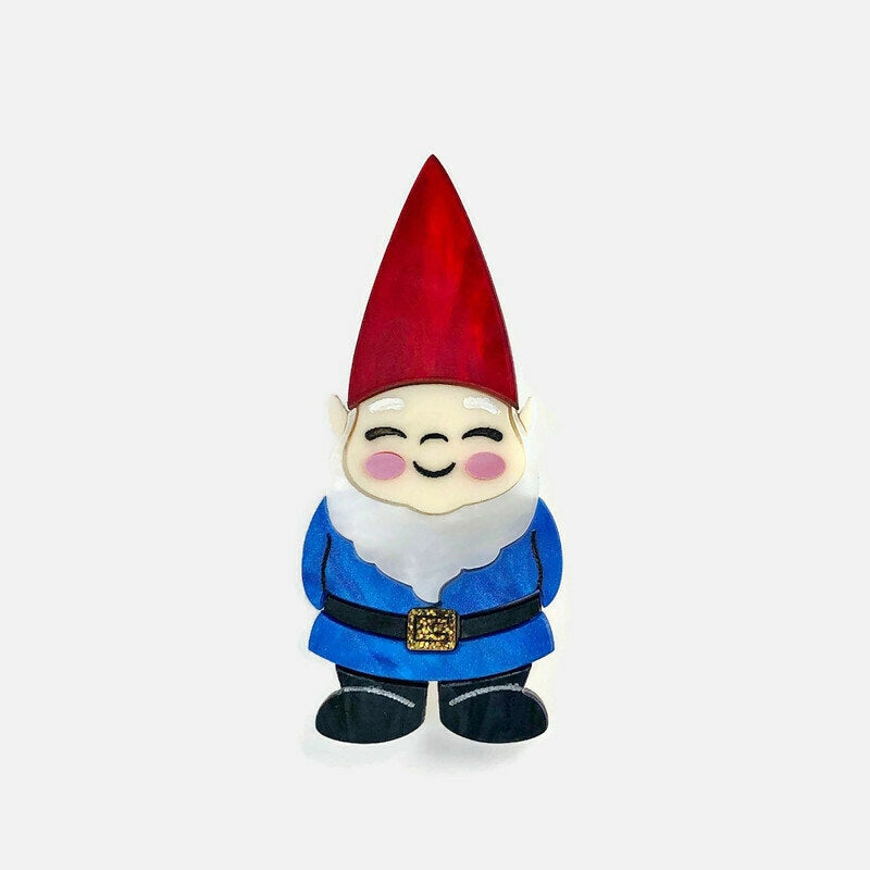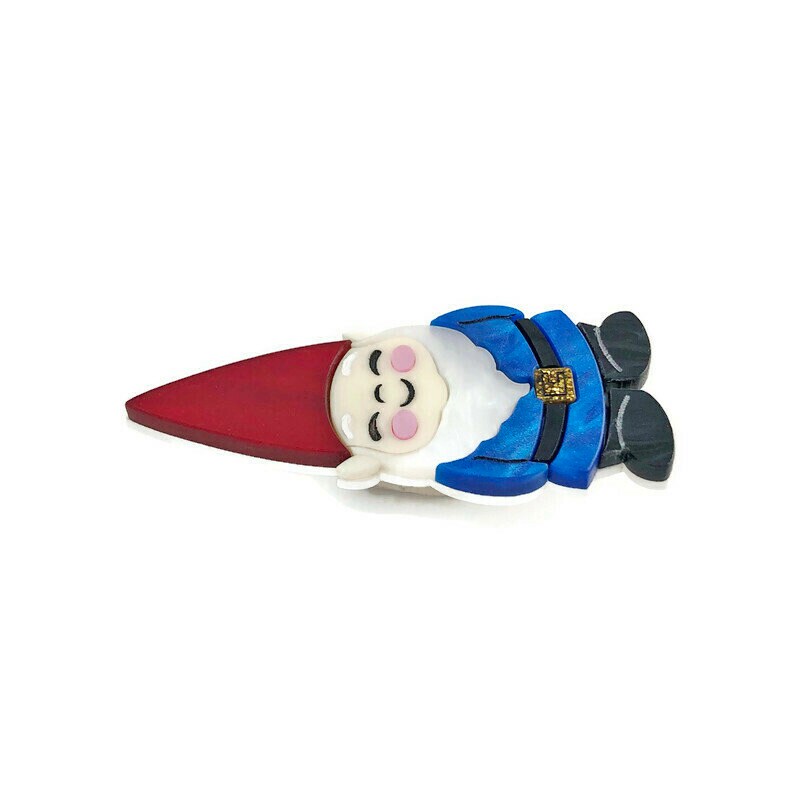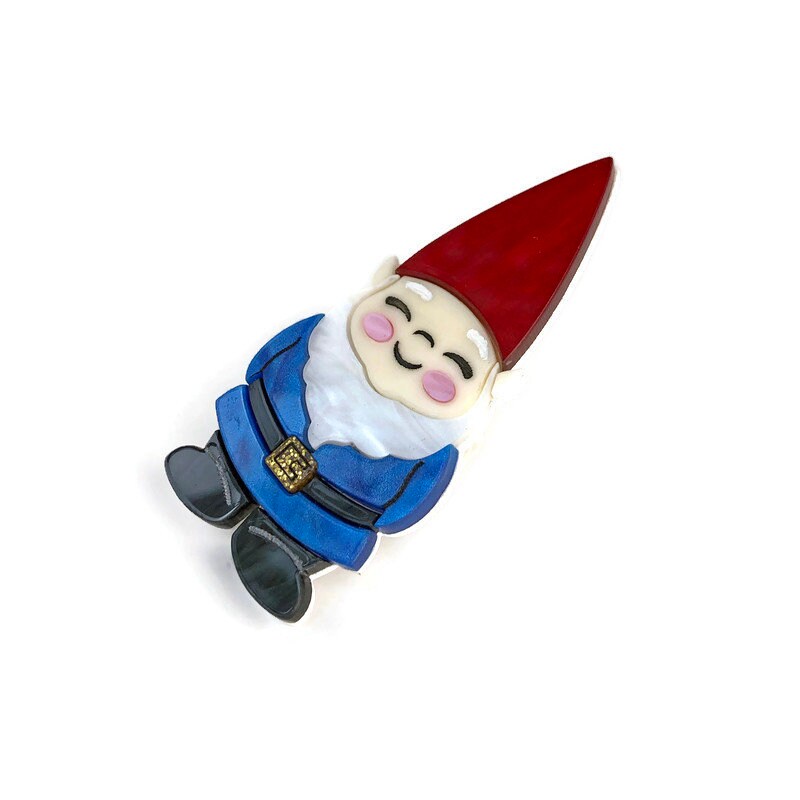 Super cute and fun this gnome brooch is sure to liven up your wardrobe. Laser cut from blue, white, red and black pearl acrylic, this garden gnome will add springtime fun to any outfit. Handcrafted from layered acrylic with hand painted details. The brooch measures approximately 3" tall x 1.34" wide and is backed with a pin back.