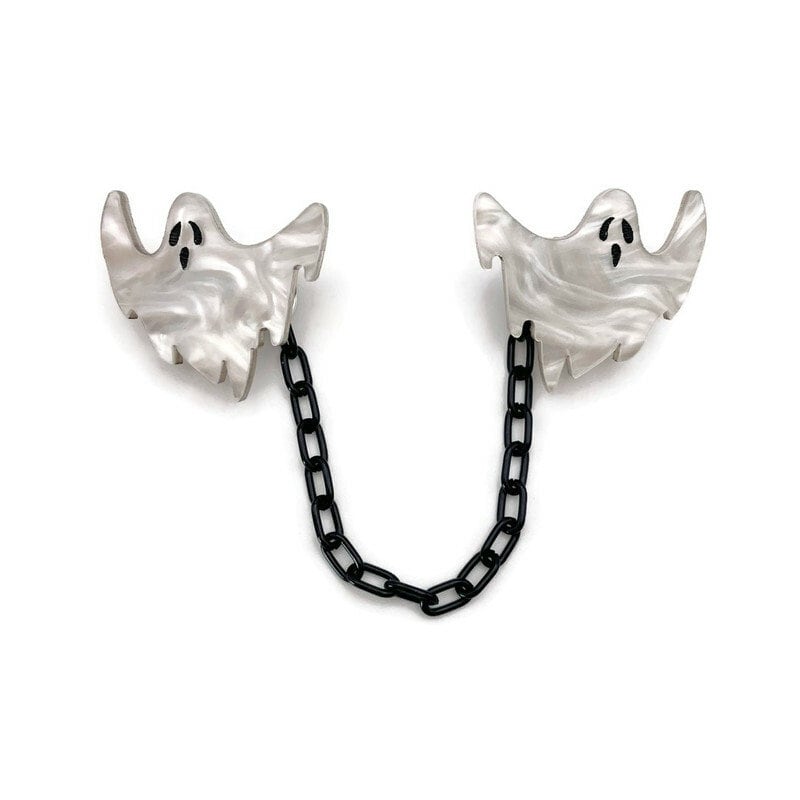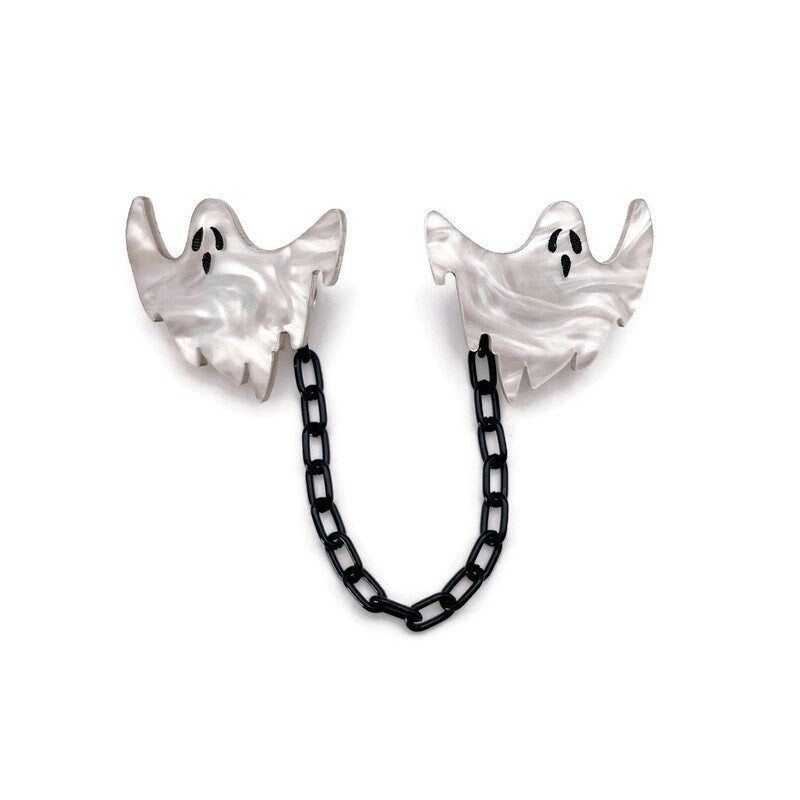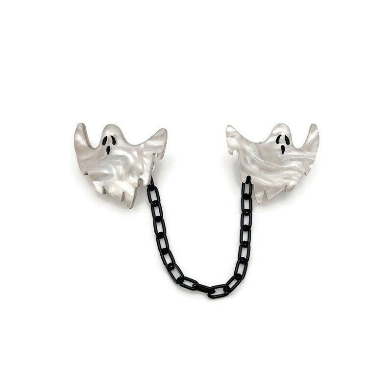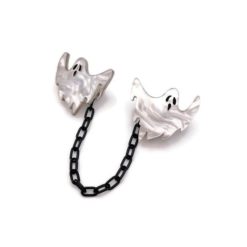 Add some spooky vibes to your cardigan or sweater with this ghost sweater clip. Laser cut from white pearl acrylic and finished with hand painted black details. Each ghost measures 1.25" wide and 1.15" tall and is affixed to an alligator style clip.