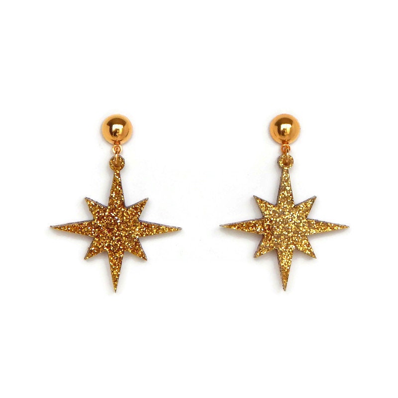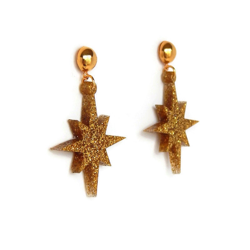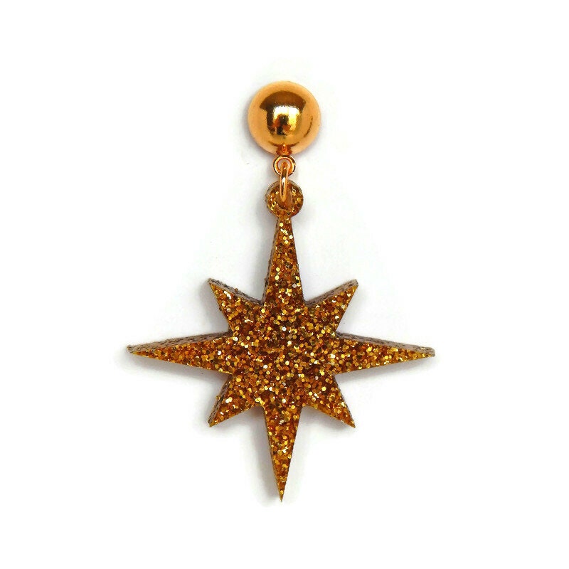 Flaunt your retro style with these 1950s inspired atomic starburst earrings. These mid century inspired star dangle earrings will add some vintage flair to any outfit, day or night. Made of gold glitter acrylic sure to get attention. The laser cut design is so lightweight you will forget you are wearing them. The comfort clutch style earring backs keep the earring snug to your ear so they don't pull or droop.