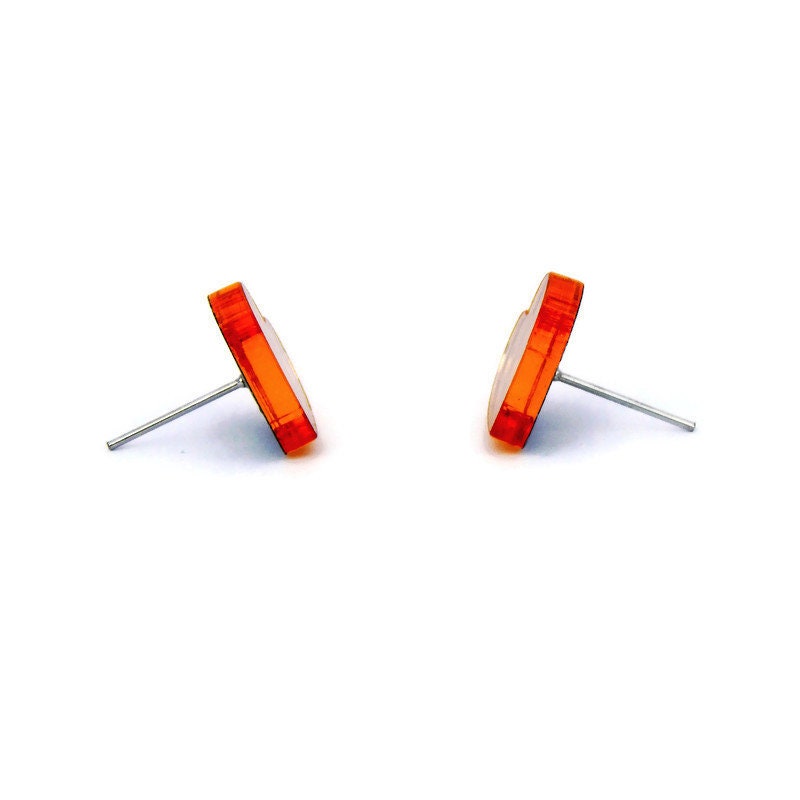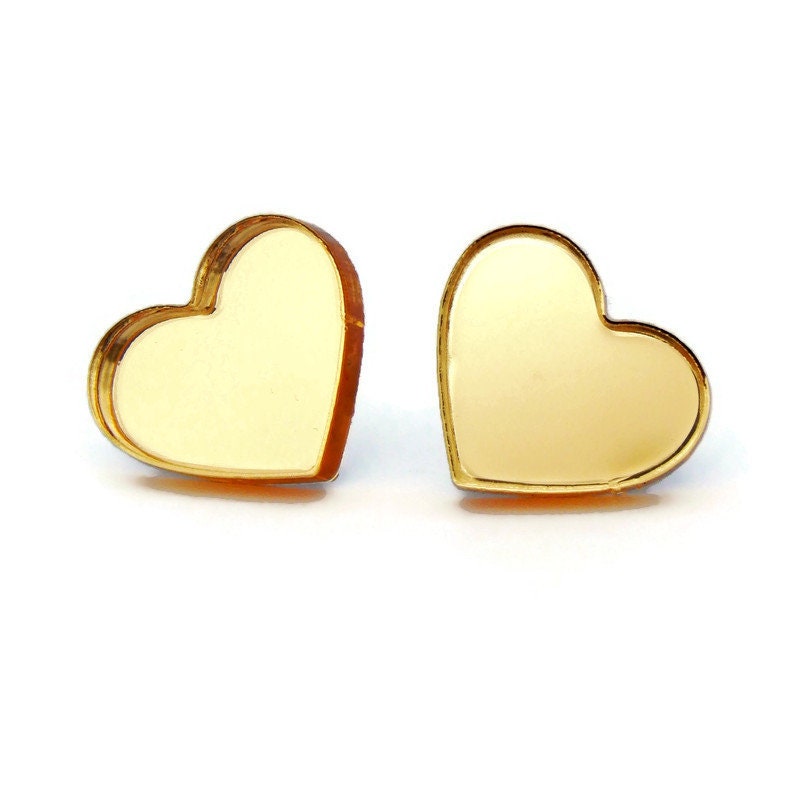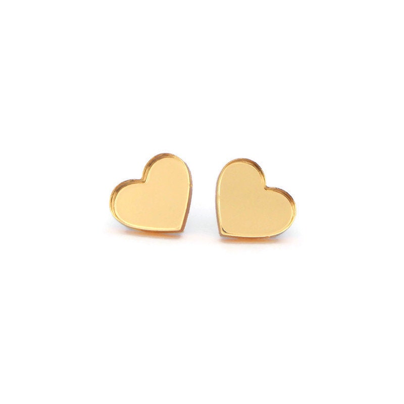 Add a little love to your everyday wardrobe with these gold heart stud earrings. Made of mirrored gold acrylic these earrings are shiny and eye-catching. These earrings are laser cut from acrylic so they are lightweight and comfortable for your ears.