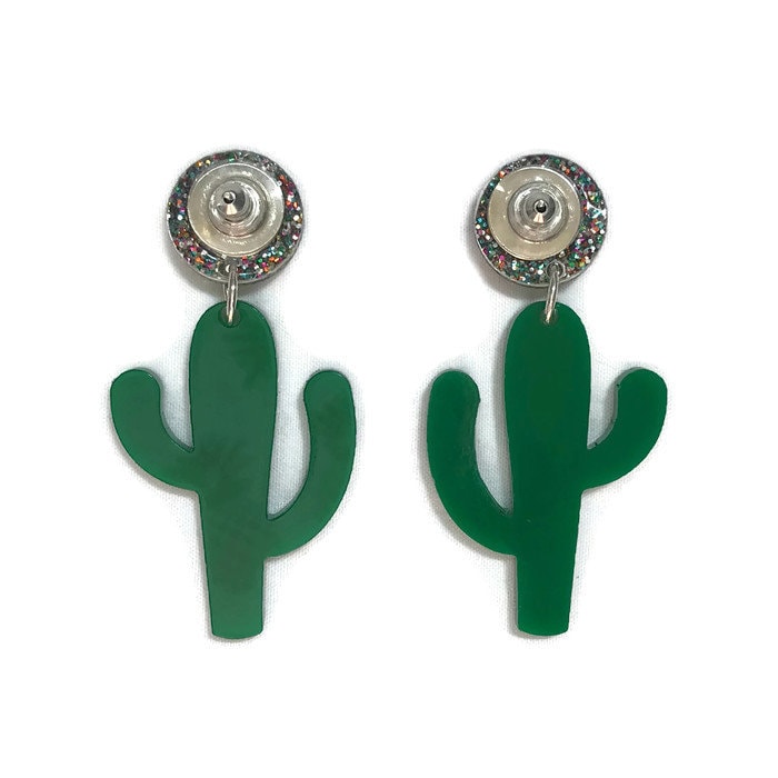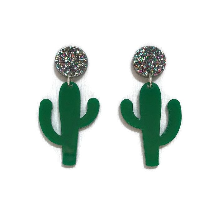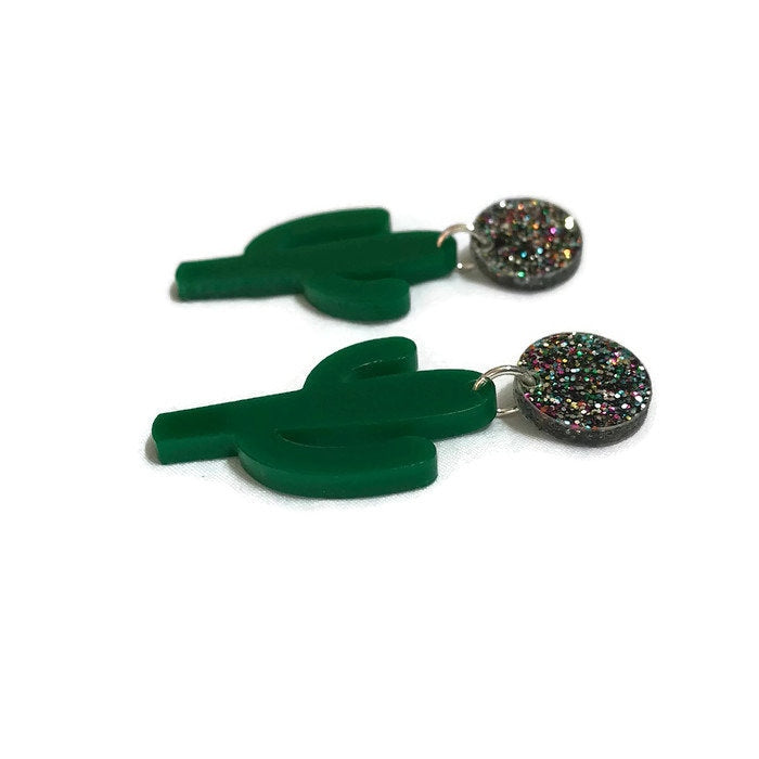 These fun and funky cactus earrings are made of lightweight acrylic. Hanging from multi-colored glitter acrylic circles are green acrylic cacti. Each glitter circle measures 14 mm in diameter and the earrings measure approximately 52 mm from top of circle to bottom of cactus and 25 mm at widest point of cactus.