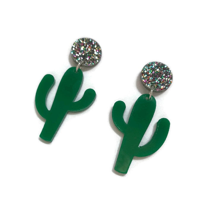 Green and Glitter Cactus Dangle Earrings