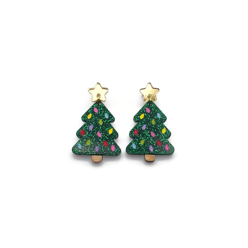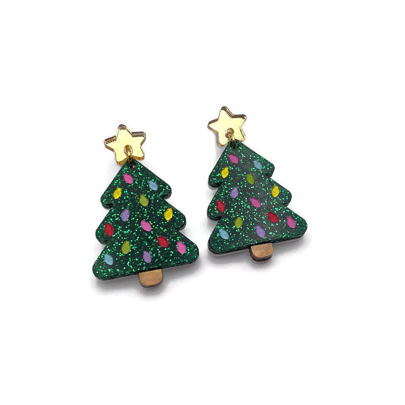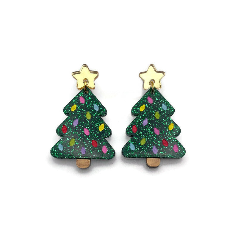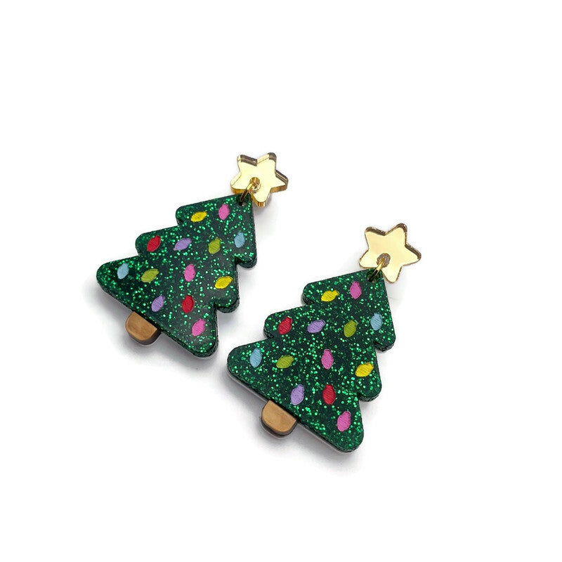 Embrace the Holiday spirit with these fun glitter Christmas tree earrings. Crafted from laser cut acrylic, these festive earrings combine nostalgic charm and modern style. Hanging from gold mirror acrylic stars are green glitter Christmas trees with hand painted accents.