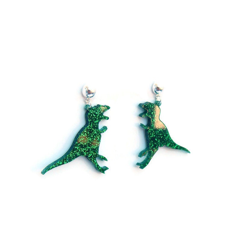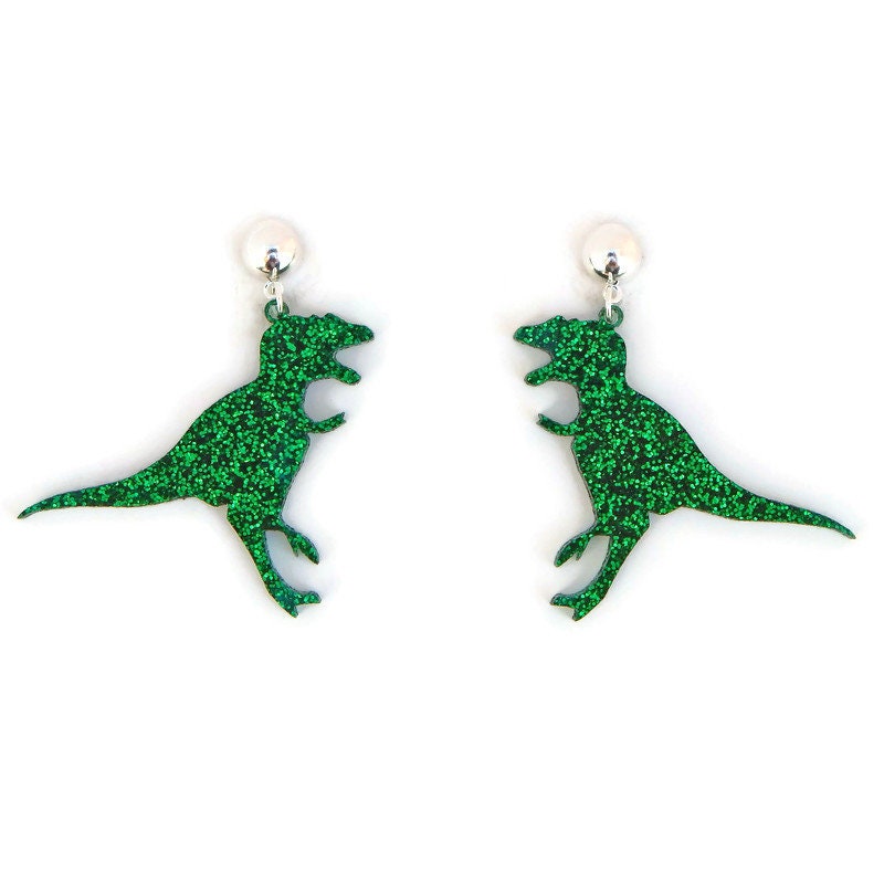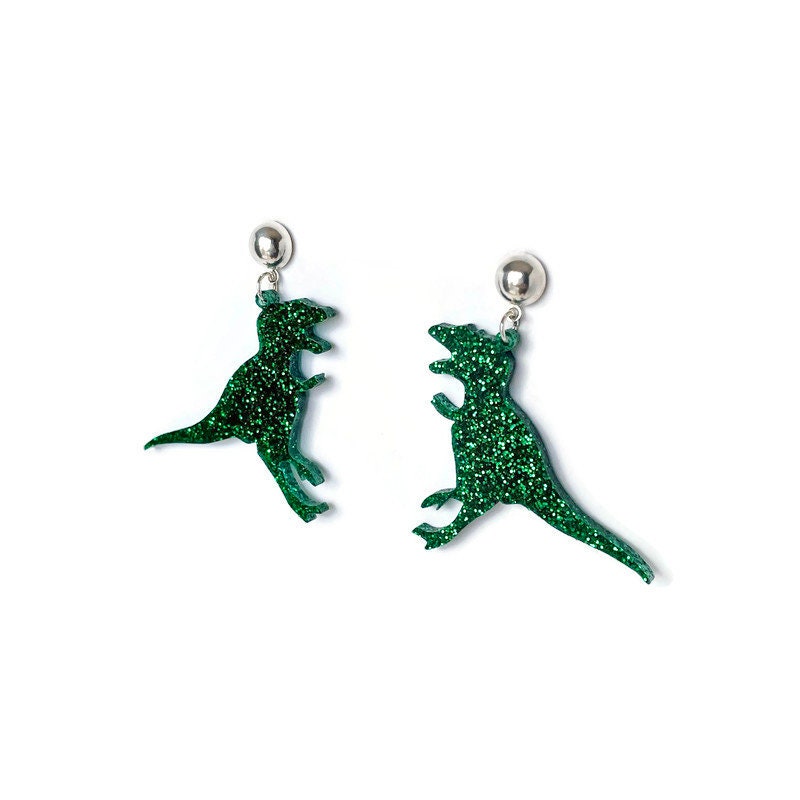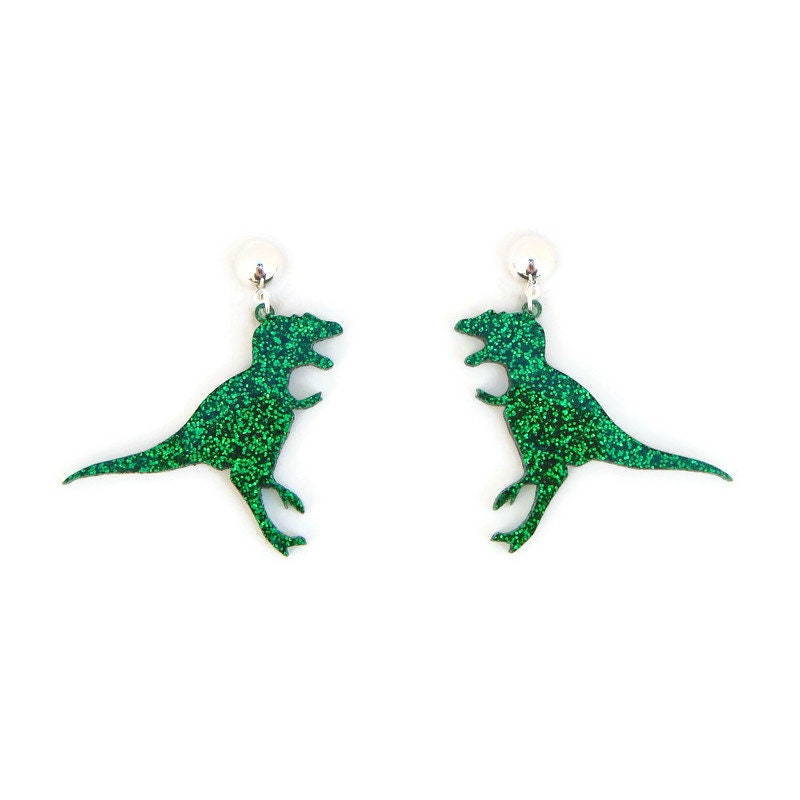 Green Glitter T-Rex Dinosaur Earrings