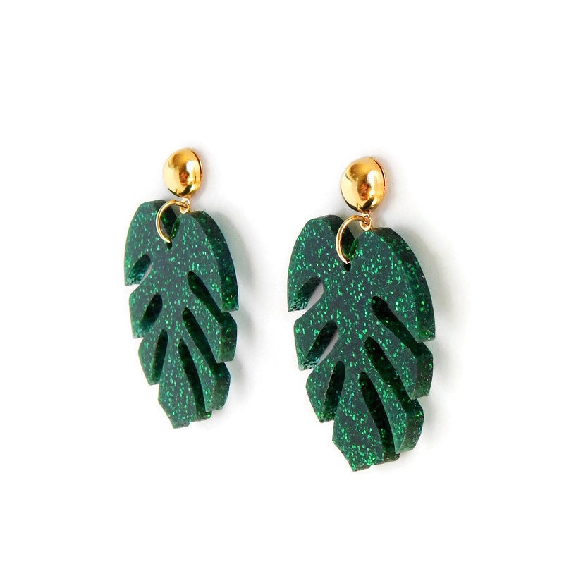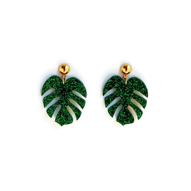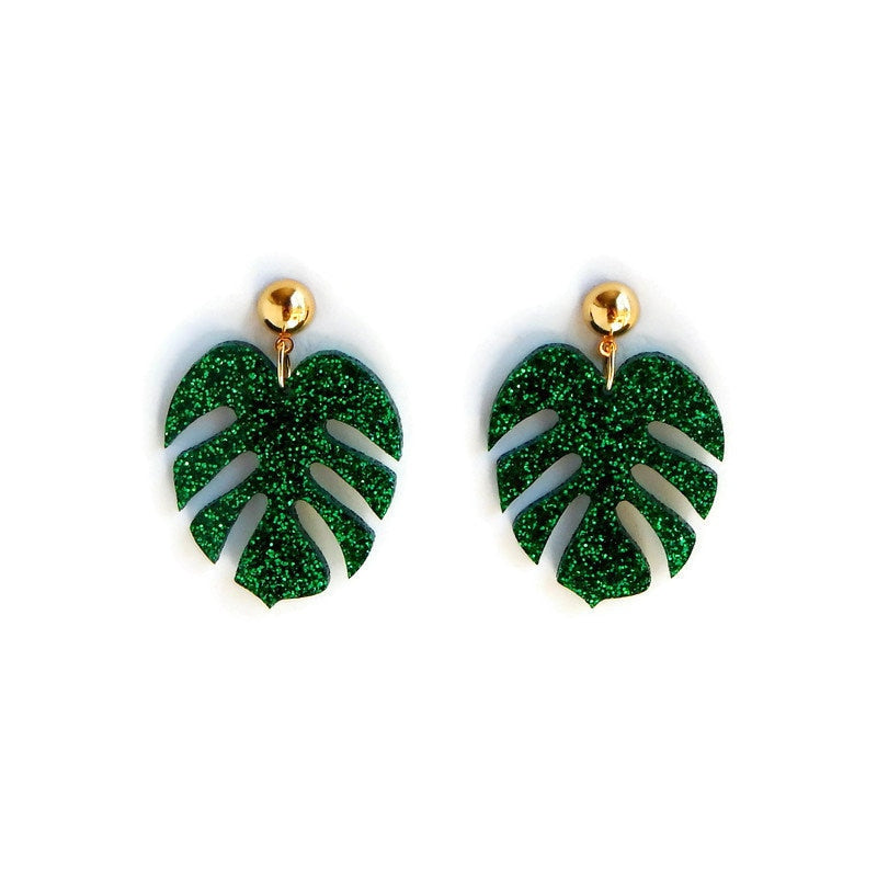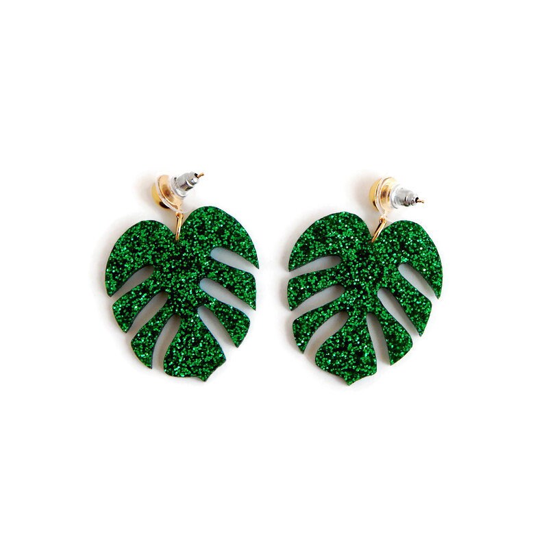 These tropical and sparkly monstera leaf earrings are perfect for summer. Made of lightweight glitter acrylic, these tropical palm leaf earrings will add lots of sparkle and tropical flair to your wardrobe. Studs measure 8mm in diameter and come in your choice of gold or silver color. Earrings measure approximately 55 mm from top of stud to bottom of leaf and 35 mm at widest point of leaf.