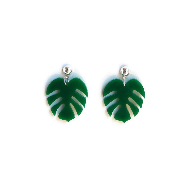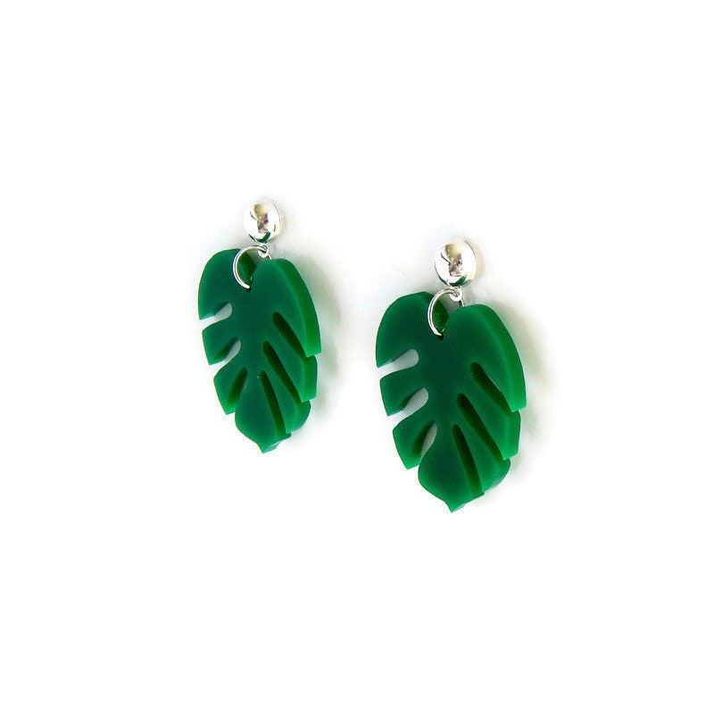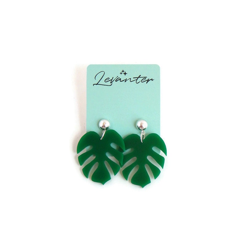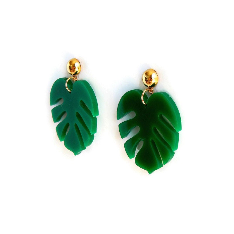 These fun and tropical monstera leaf earrings are perfect for summer. Made of lightweight green acrylic, these tropical palm leaf earrings will add lots of fun and tropical style to your wardrobe. Studs measure 8mm in diameter and come in your choice of gold or silver color. Earrings measure approximately 55 mm from top of stud to bottom of leaf and 35 mm at widest point of leaf.