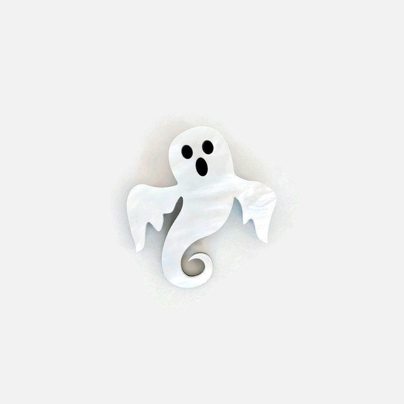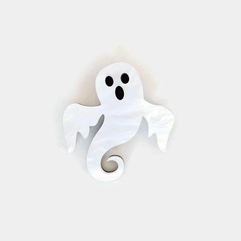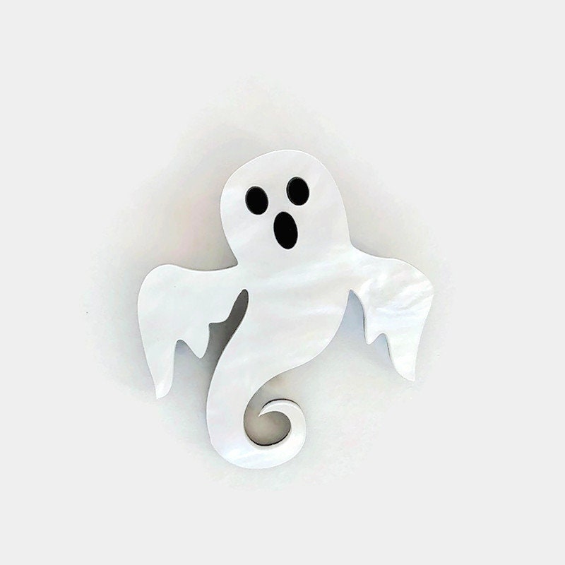 This spooky ghost brooch is the perfect accessory to add some Halloween fun to your wardrobe. The ghost is laser cut from black and pearl white acrylic. Made of double layered acrylic for sturdiness without added weight. Brooch measures about 2.4" wide by 2.5" tall and is backed with a brooch pin.