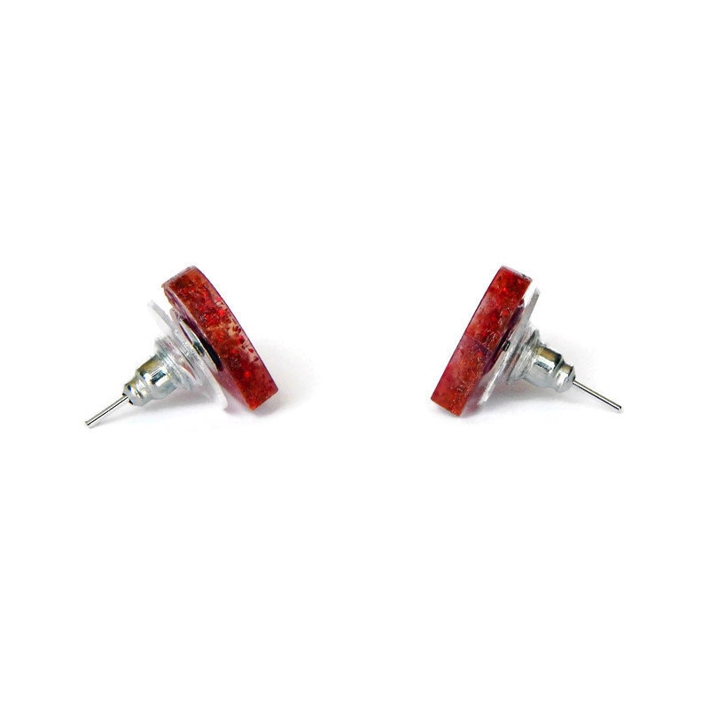 Add a little love to your everyday wardrobe with these red glitter heart stud earrings. Made of glitter acrylic these earrings are sparkly and eye-catching. These earrings are laser cut from acrylic so they are lightweight and comfortable for your ears.