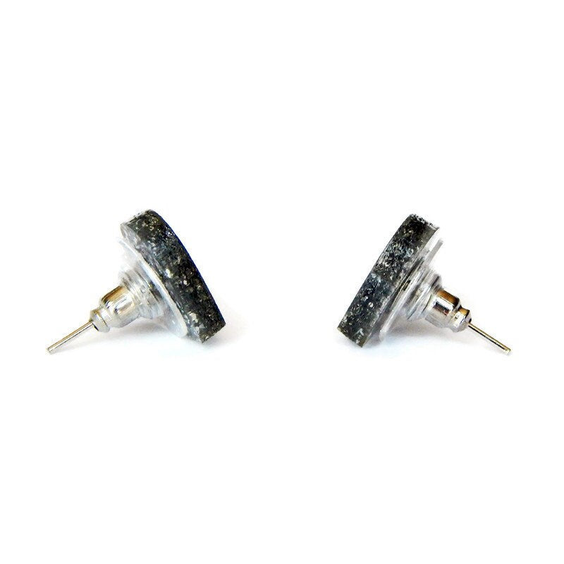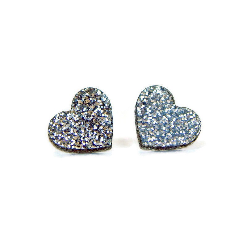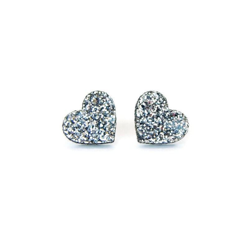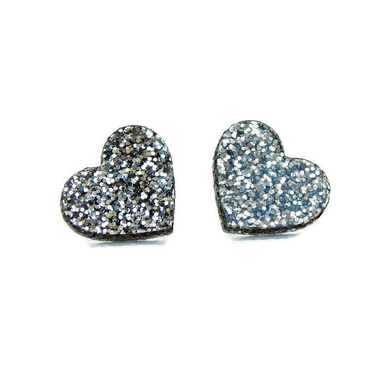 Add a little love to your everyday wardrobe with these silver glitter heart stud earrings. Made of glitter acrylic these earrings are sparkly and eye-catching. These earrings are laser cut from acrylic so they are lightweight and comfortable for your ears.
