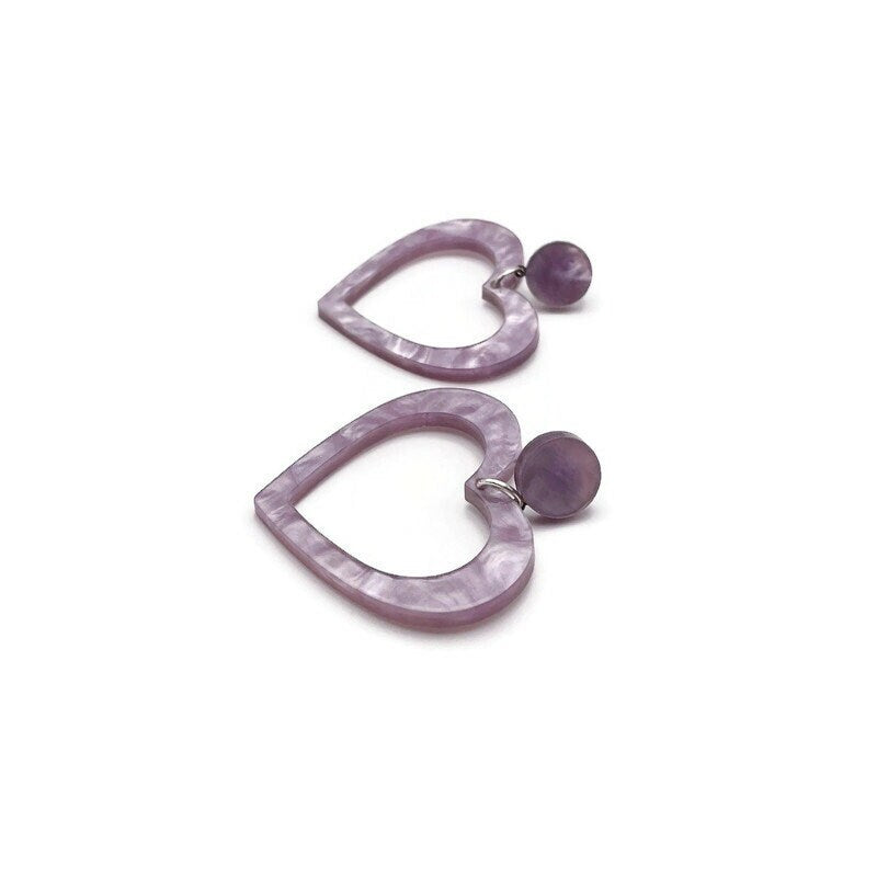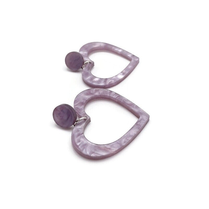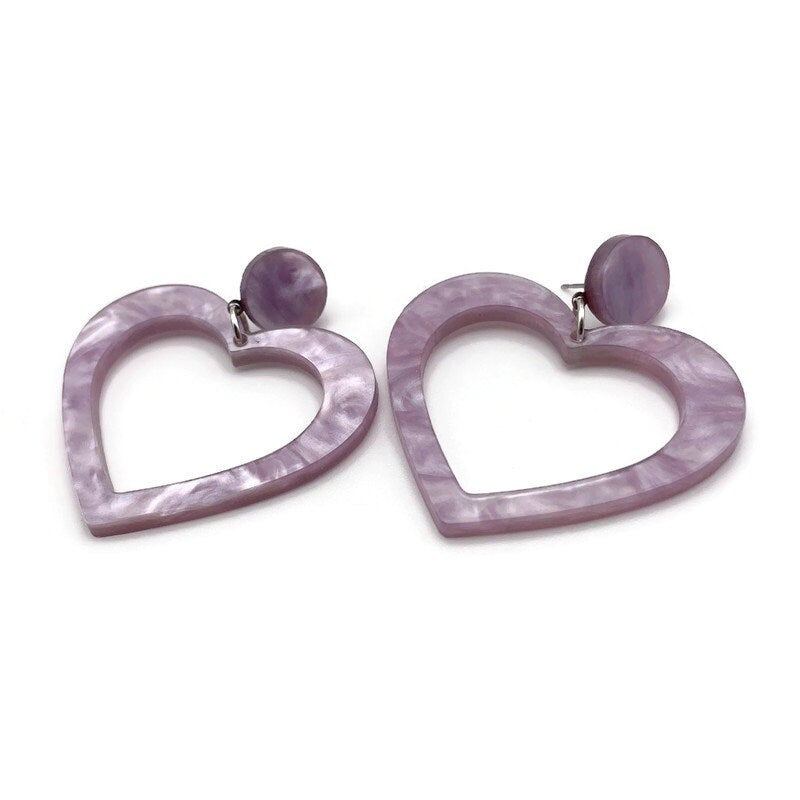 The Lavender Pearl Heart Hoop Earrings are a sweet retro inspired statement piece. Made from lightweight lavender pearl acrylic, these 2" heart shaped dangle earrings will add the perfect pop of color to your wardrobe. They are the perfect accessory to your favorite outfit, adding just the right amount of vintage flair.