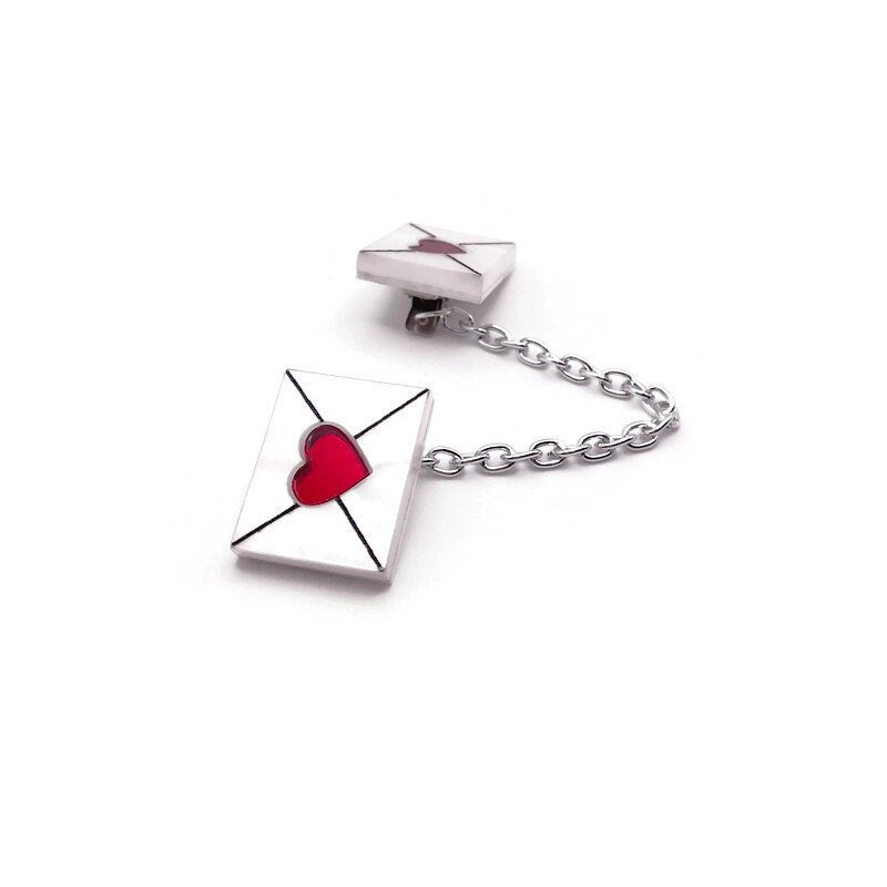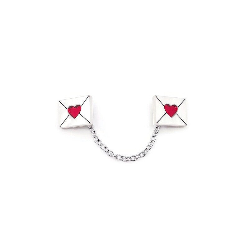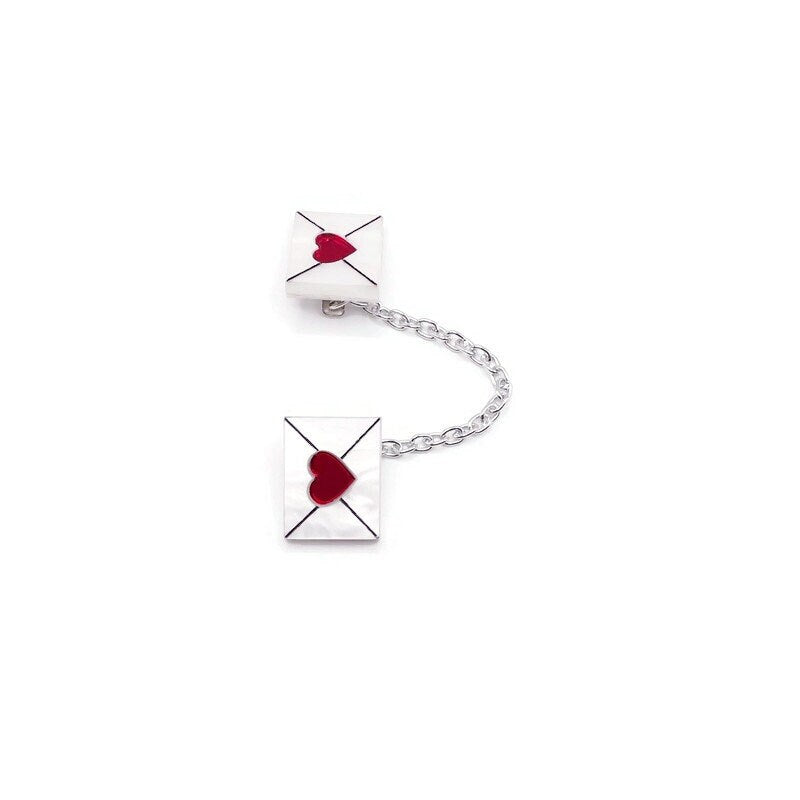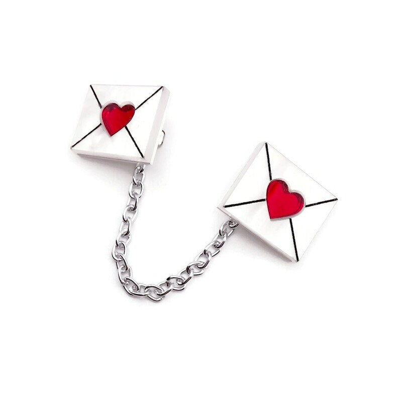 Perfect for Valentine's Day accessorizing, this love letter sweater clip is sure to compliment any cardigan. Laser cut from white pearl acrylic and red mirror acrylic for a distinctly vintage look. Each piece is lovingly hand assembled and backed by alligator clips to cling snugly to your sweater or collar. Chain comes in 4" or 6" lengths so you can choose your perfect length.