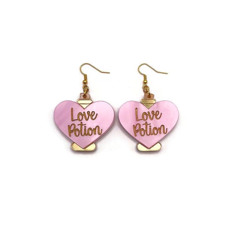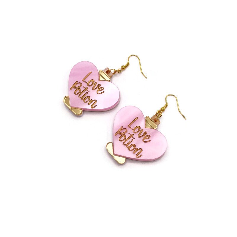 Perfect for Valentine's Day accessorizing, the Love Potion earrings are sure to enchant. Laser cut from different finishes of pink pearl and gold mirror acrylic, these big and bold earrings are surprisingly light weight. Each piece features hand painted details and is lovingly hand assembled.