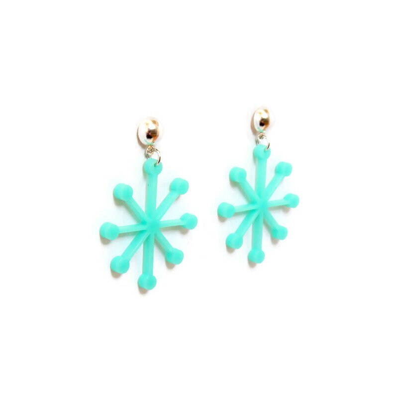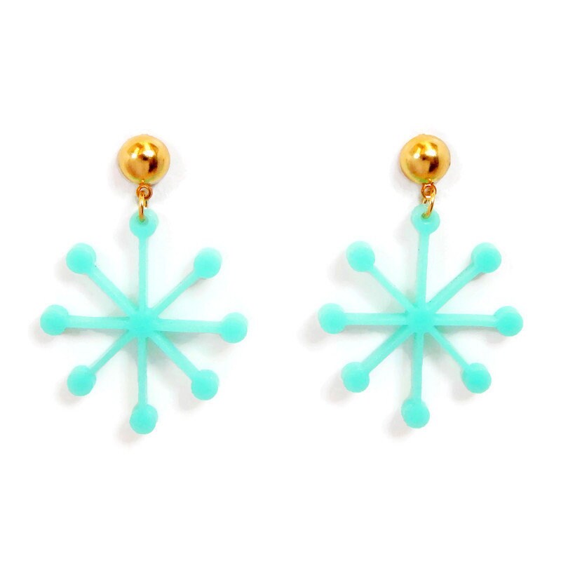 Add some mid century modern fun to your wardrobe with these sputnik shape earrings. These mid century inspired aqua acrylic dangle earrings will add some vintage flair to any outfit, day or night. The laser cut design is so lightweight you will forget you are wearing them and comes with your choice of gold or silver half ball studs. The comfort clutch style earring backs keep the earring snug to your ear so they don't pull or droop.