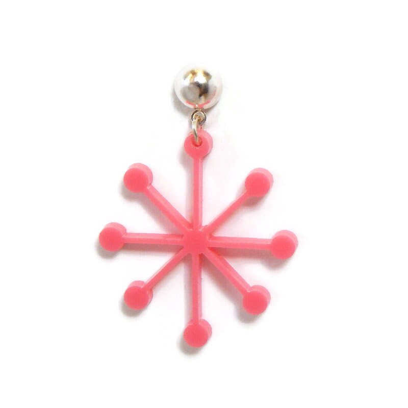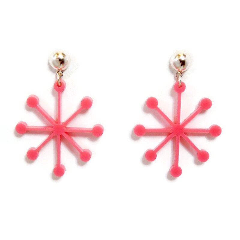 Add some mid century modern fun to your wardrobe with these sputnik shape earrings. These mid century inspired pink acrylic dangle earrings will add some vintage flair to any outfit, day or night. The laser cut design is so lightweight you will forget you are wearing them and comes with your choice of gold or silver half ball studs. The comfort clutch style earring backs keep the earring snug to your ear so they don't pull or droop.