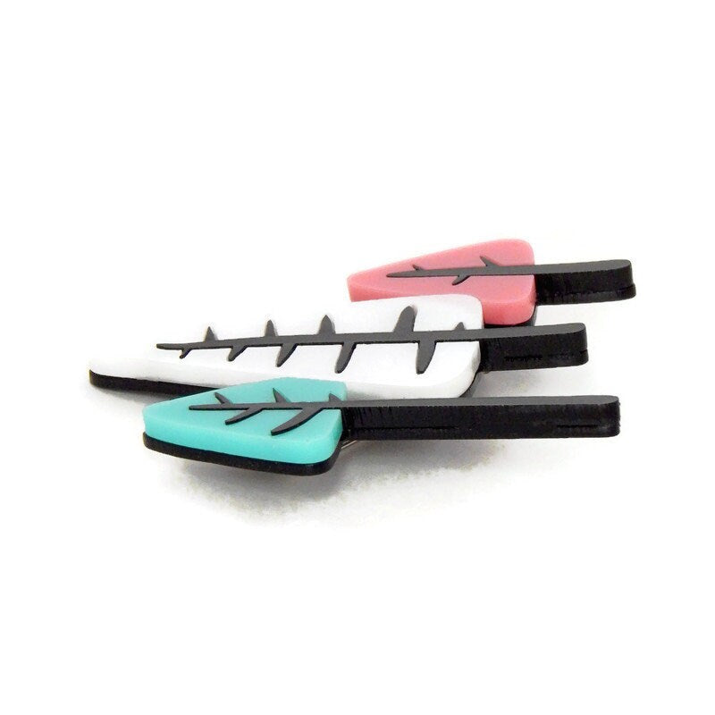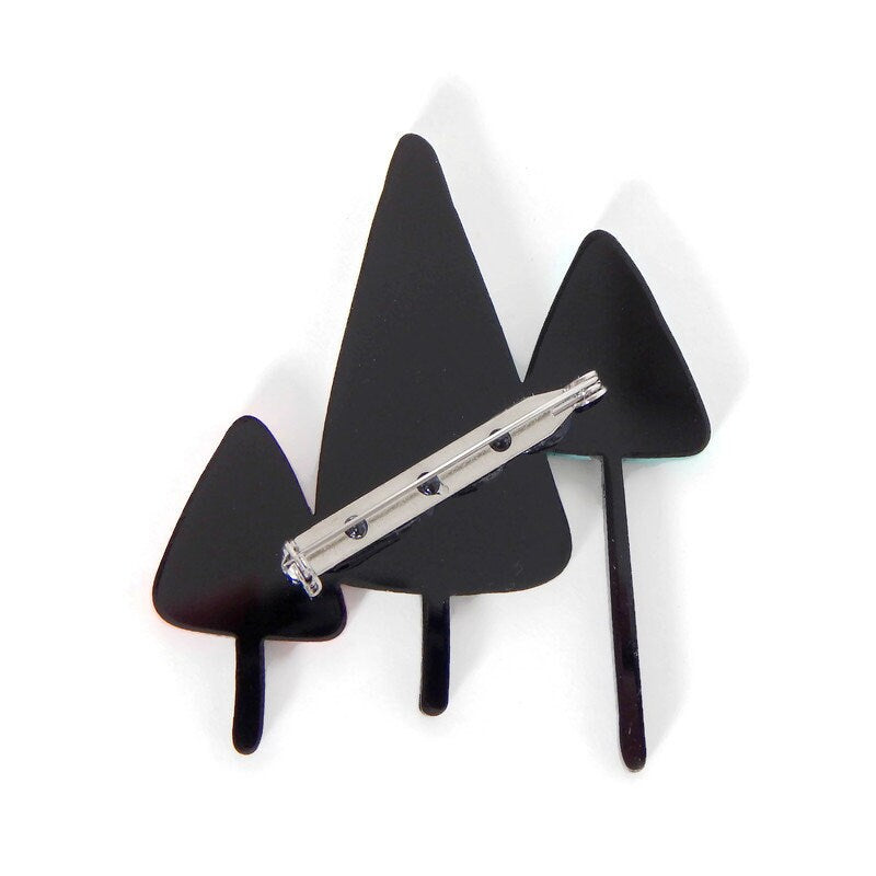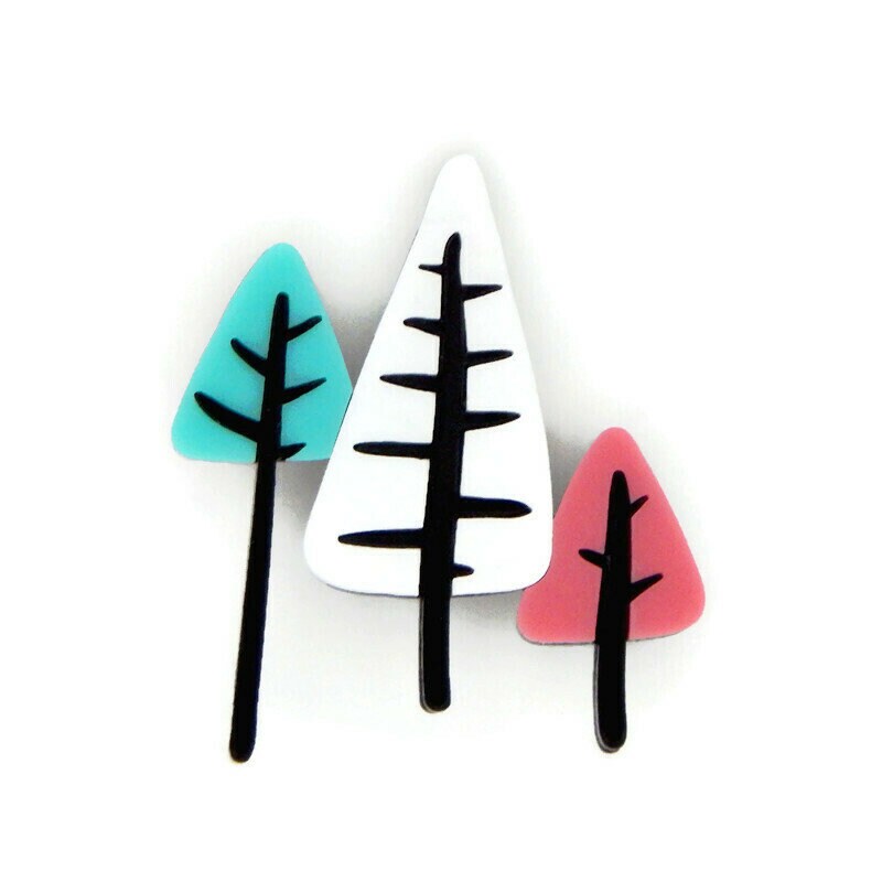 Inspired by Mid Century Modern design of the 50s and 60s this tree brooch is fun and nostalgic. A white pearl acrylic tree is set between two smaller trees, one pink and one aqua. Laser cut from lightweight acrylic to be big and bold without the added weight. The brooch measures approximately 2.5 inches tall and 2.5 inches wide and is backed with a pin back.