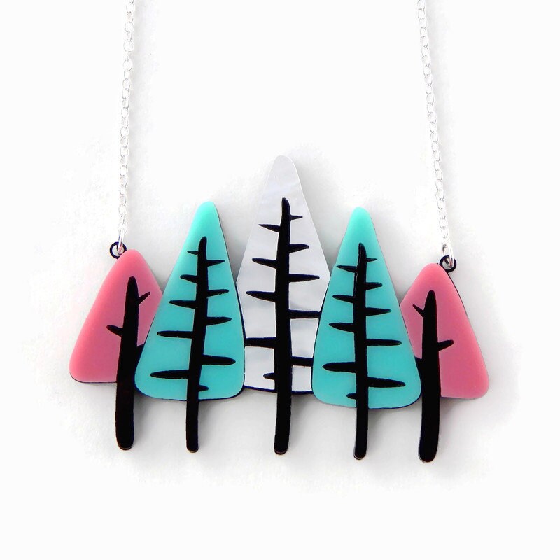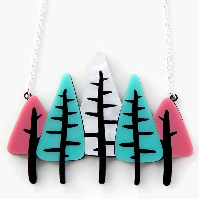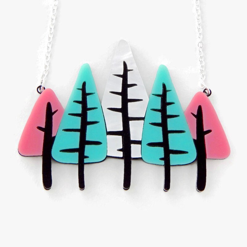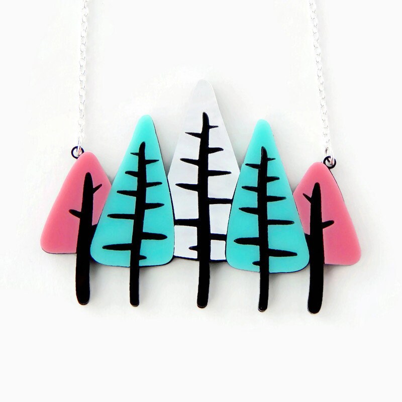 Add some mid century modern style to your outfit with this tree statement necklace. Five trees are laser cut from pink, aqua and white acrylic with black trunks and branches. Double layered laser cut acrylic adds interest without added weight. The pendant makes a statement at approximately 2.25 inches tall and 3 inches wide and hangs from a silver plated necklace chain. This necklace comes in 2 chain lengths: 16 inches with a 1-1/4 inch extender and 18 inches with a 1-1-4 inch extender so you can find your perfect length.