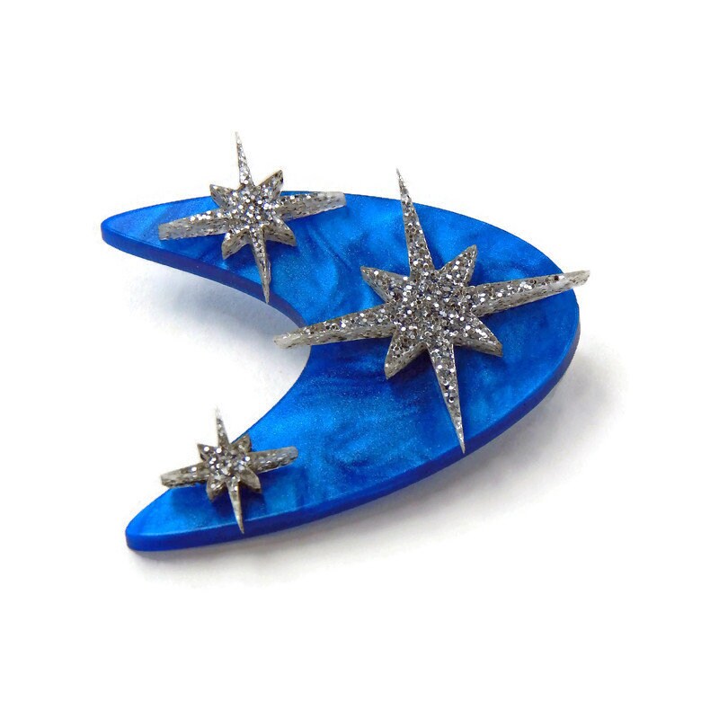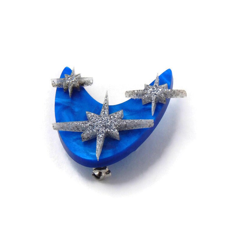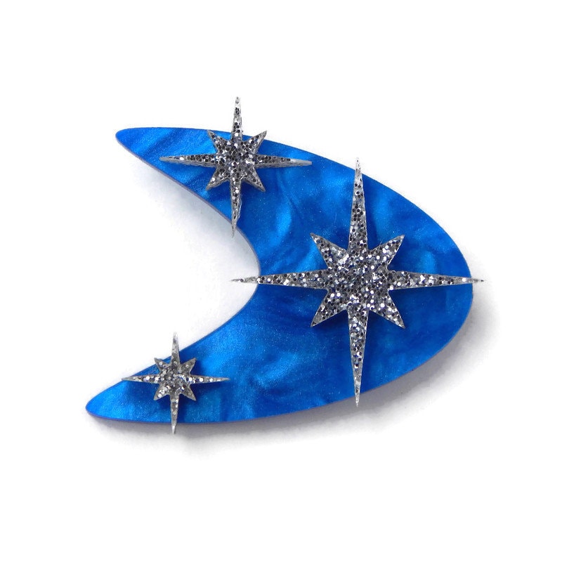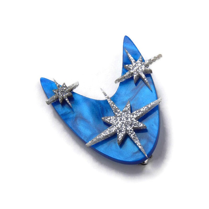 Inspired by Mid Century Modern design of the 50s and 60s this boomerang and stars brooch is stunning and nostalgic. A blue pearl acrylic boomerang is adorned with 3 varying sizes of silver glitter acrylic starbursts. The brooch measures approximately 1.9375 inches tall and 2 inches wide and is backed with a pin back.