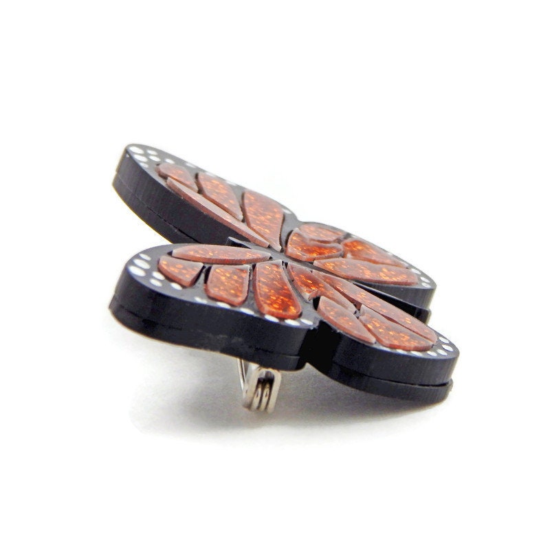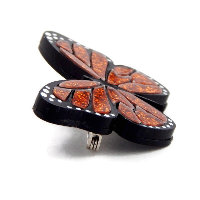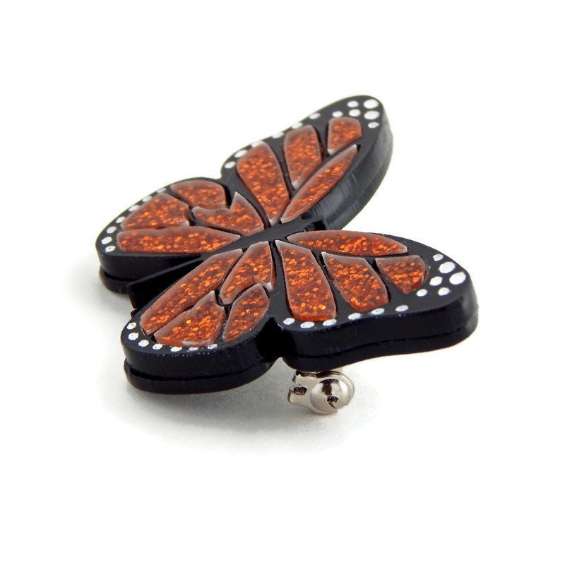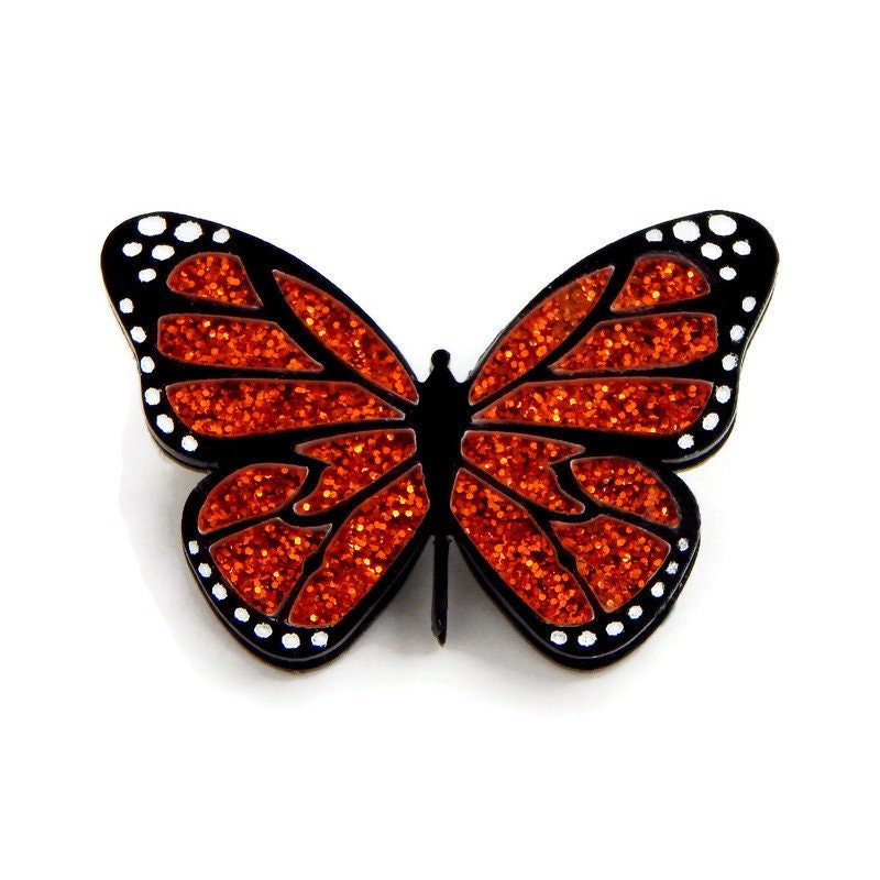 Liven up your wardrobe with this monarch butterfly brooch. Laser cut from black and coppery orange glitter acrylic, this butterfly will add color and fun to any outfit. Made from layered acrylic, black and orange glitter atop a black base with hand painted white details. The brooch measures approximately 33 mm (about 1.29") x 50 mm (just under 2") and is backed with a pin back.