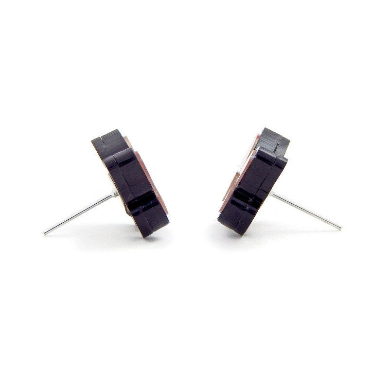 These earrings are laser cut from acrylic so they are lightweight and comfortable for your ears. Earrings measure 14 mm tall (about .55") and 20 mm wide (about .78"). Earring posts are nickel and lead free for sensitive ears and come with comfort clutch type backs to keep the earring snug to your ear.