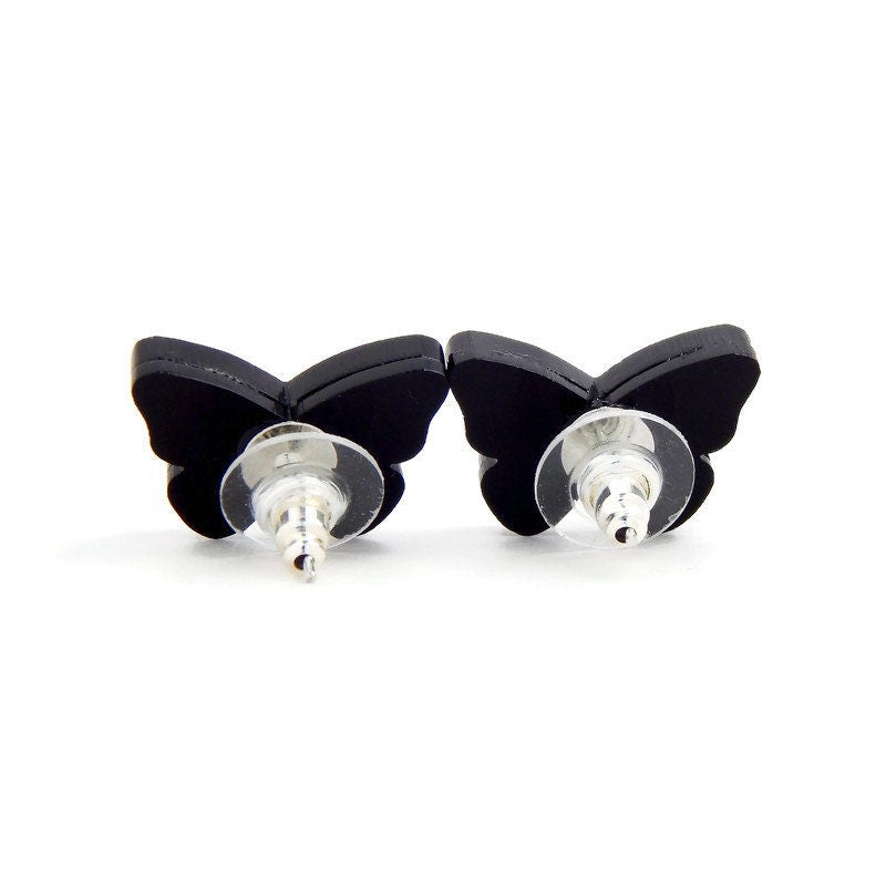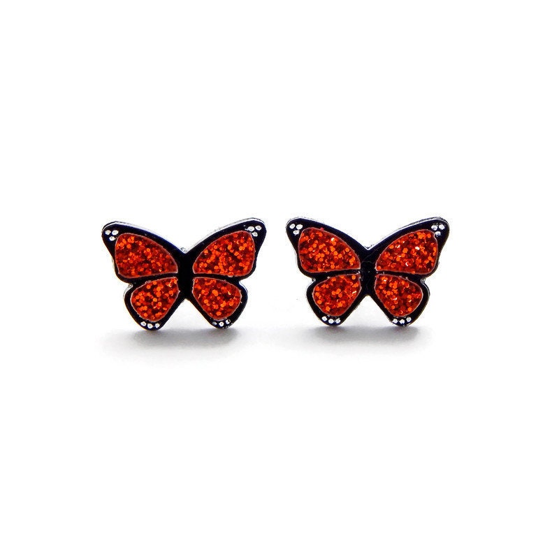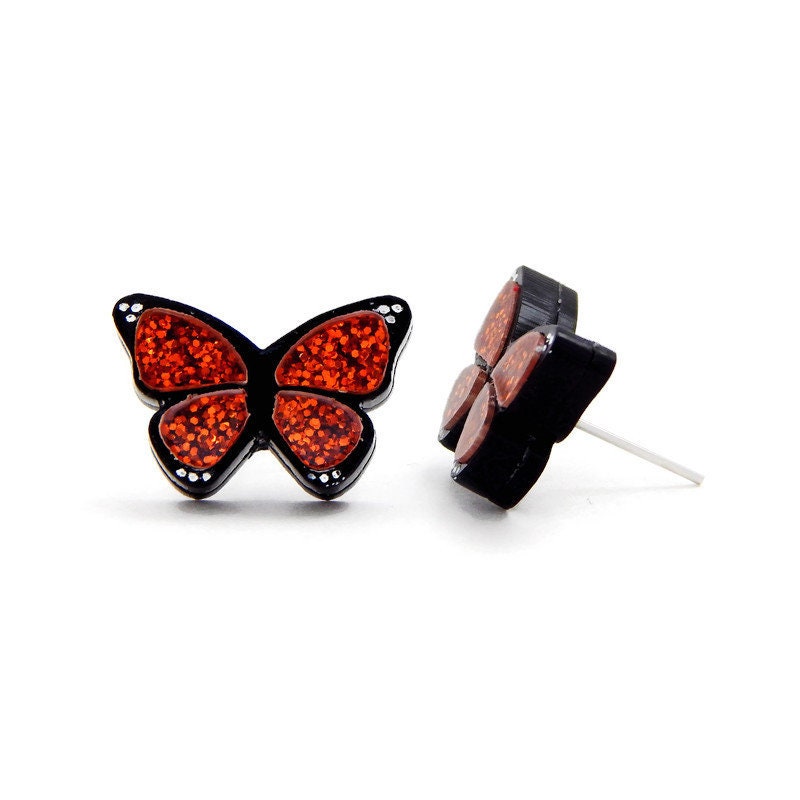 Liven up your wardrobe with these Monarch butterfly earrings. Laser cut from black and coppery orange glitter acrylic, these earrings will add color and fun to any outfit. Made from layered acrylic, black and orange glitter atop a black base with hand painted white details.