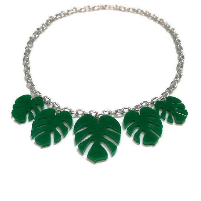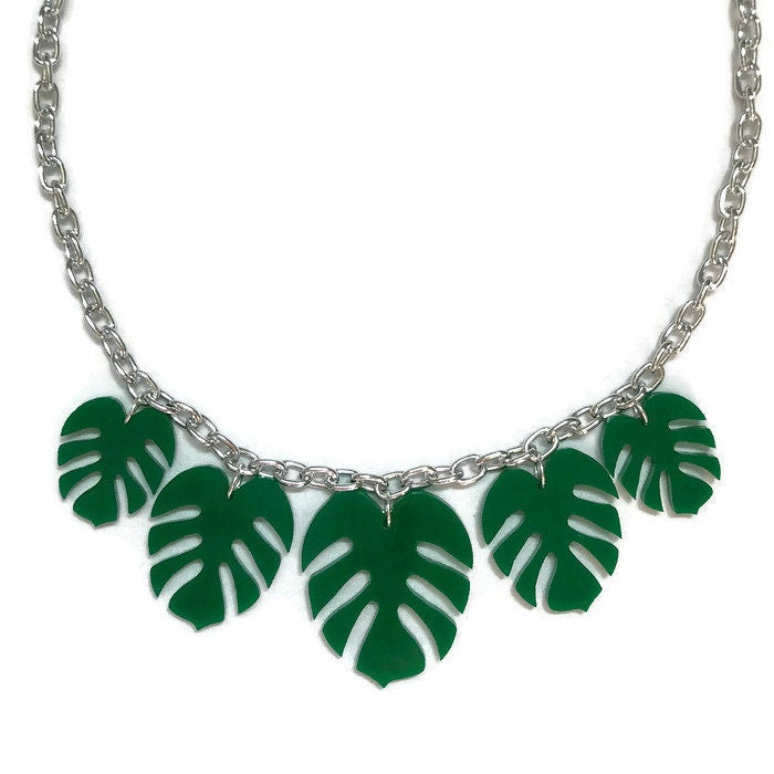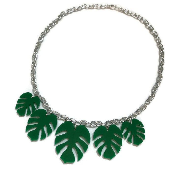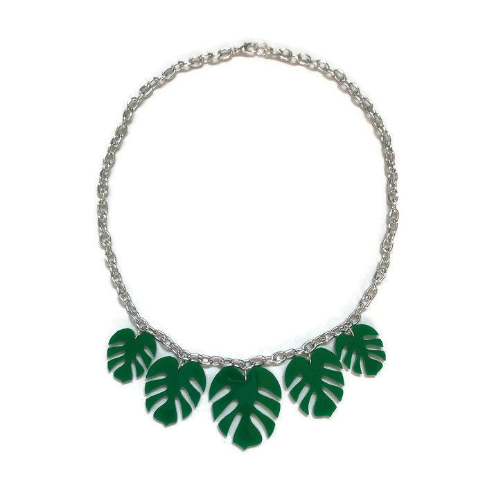 Inspired by the tropics this leaf necklace is fun and retro. Made in the style of plastic jewelry of the 40s and 50s, this necklace features 5 monstera leaves in graduated sizes. Each leaf is laser cut from lightweight green acrylic and hung from a thick silver colored cable chain. The perfect statement necklace for summer!