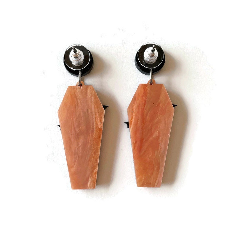 Crafted with orange marble and black lightweight acrylic and nickel free earring posts the coffin earrings are perfect for those looking to up their Halloween style without being weighed down with heavy earrings.