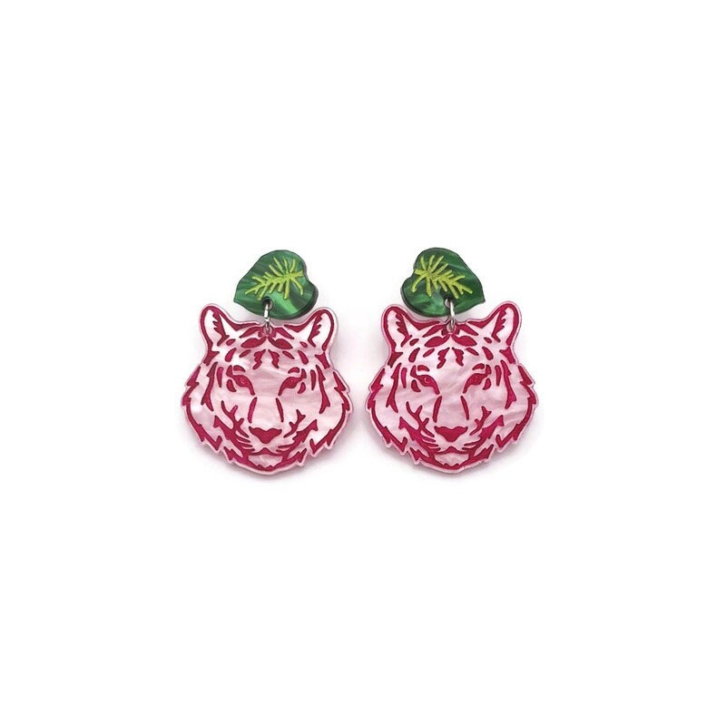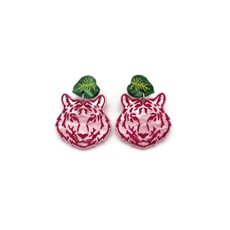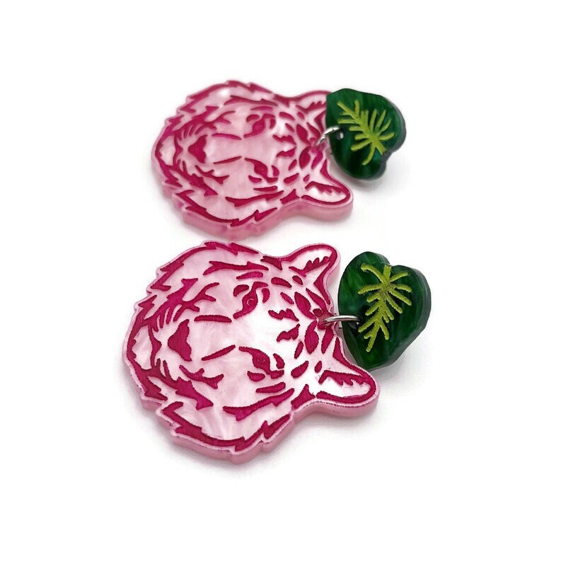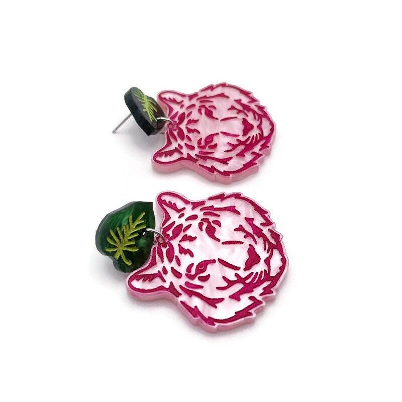 These bold acrylic earrings are the perfect solution for fun fashion lovers who want to add some color and drama to their summer wardrobe. Made with lightweight pink pearl acrylic, these tigers are hand painted with fuchsia details. Each tiger hangs from a green marble acrylic leaf. Laser cut from acrylic, these earrings while big and bold, are surprisingly lightweight.