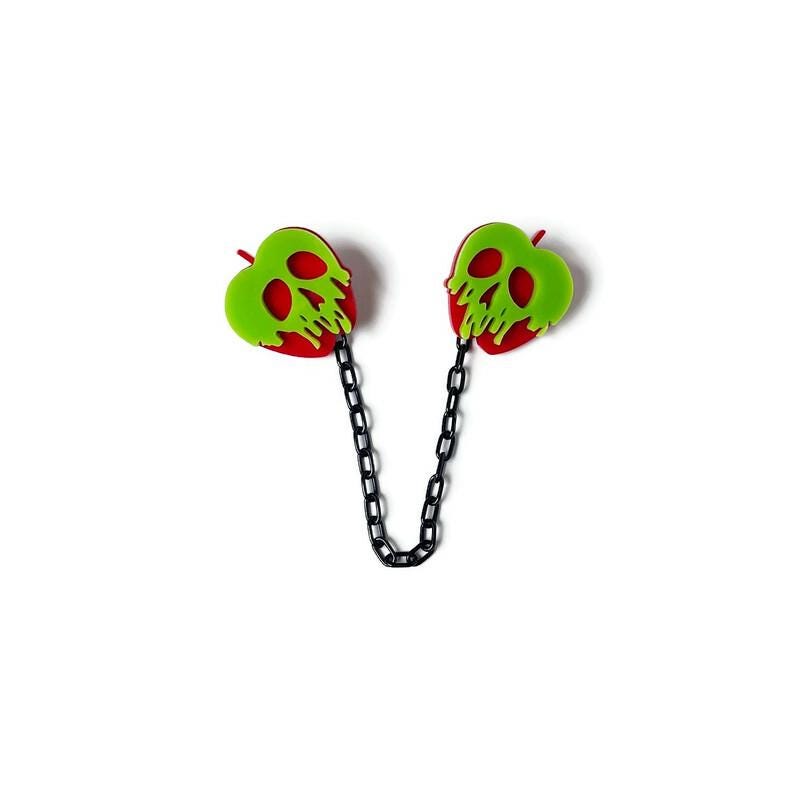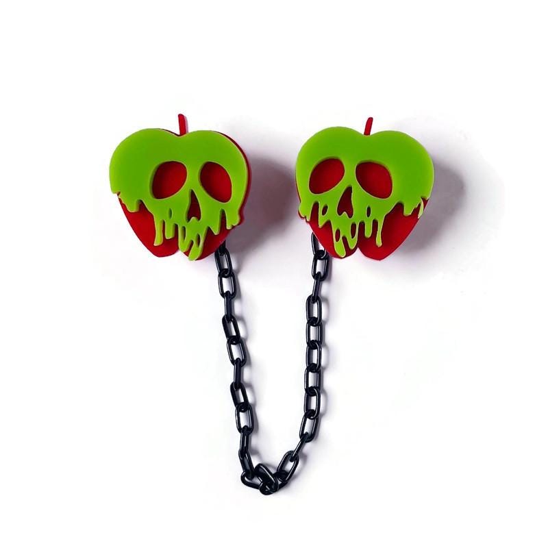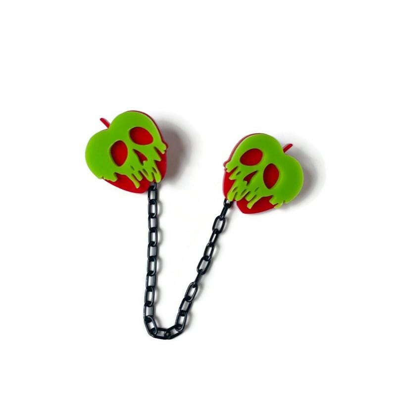 Add a touch of enchantment to your wardrobe with this handmade Poison Apple Sweater Clip! Crafted from vibrant red and green laser-cut acrylic, each apple evokes the allure of a fairy tale, with just a hint of danger. The apples are securely attached to alligator clip backs, ensuring they stay in place while adding a unique and playful detail to your sweater, cardigan, or blouse. Each apple measures 35mm (1.38") from top to bottom and 30mm (1.18") wide. Choose between a 4” or 6” black chain to perfectly suit your style. Whether you're channeling your inner villain or simply love eye-catching accessories, this poison apple sweater clip is the perfect way to make any outfit feel a little more magical!