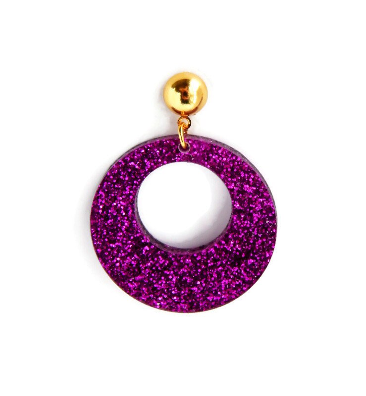 These dangling fuchsia glitter hoop earrings are both retro and timeless. Made from lightweight acrylic for maximum comfort and style without the added weight. This classic design will add some vintage flair to any outfit, day or night. The fuchsia purple glitter finish gives these earrings lots of sparkle and visibility. Comes with gold or silver colored half ball studs, choose your color from the drop down menu.