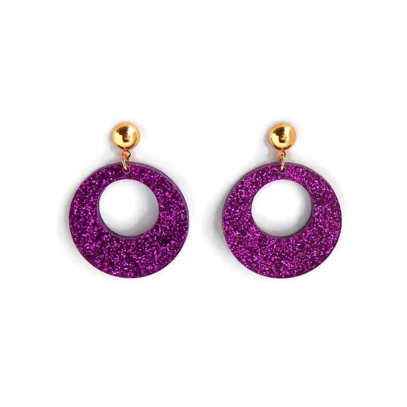 Fuchsia Purple Glitter Acrylic Circle Hoop Earrings