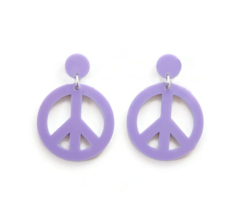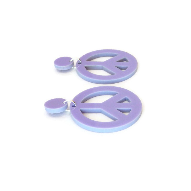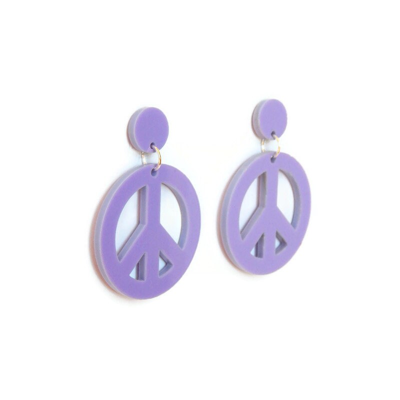 These peace sign earrings are designed with lightweight purple acrylic and hang from an acrylic circle stud.