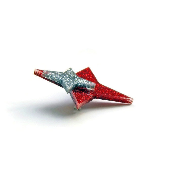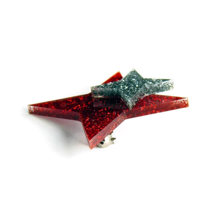 This fun and retro double star brooch is inspired by the atomic 50's. Made of red and silver glitter acrylic this brooch is the perfect accent for your cardigan, top or dress.