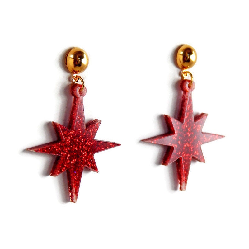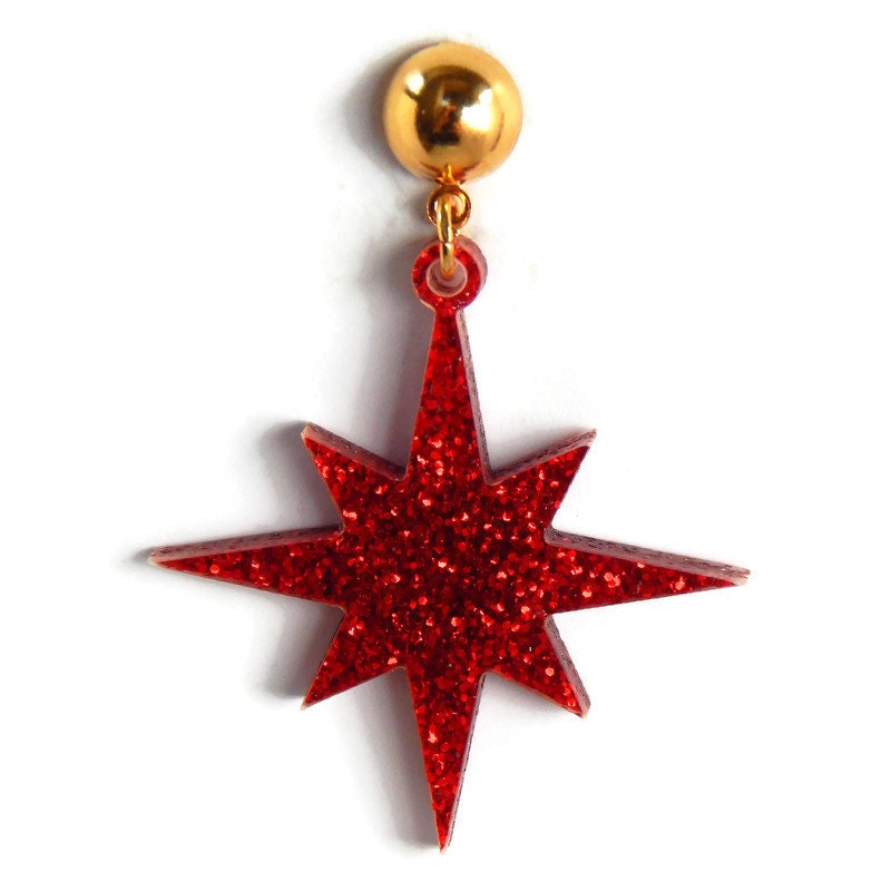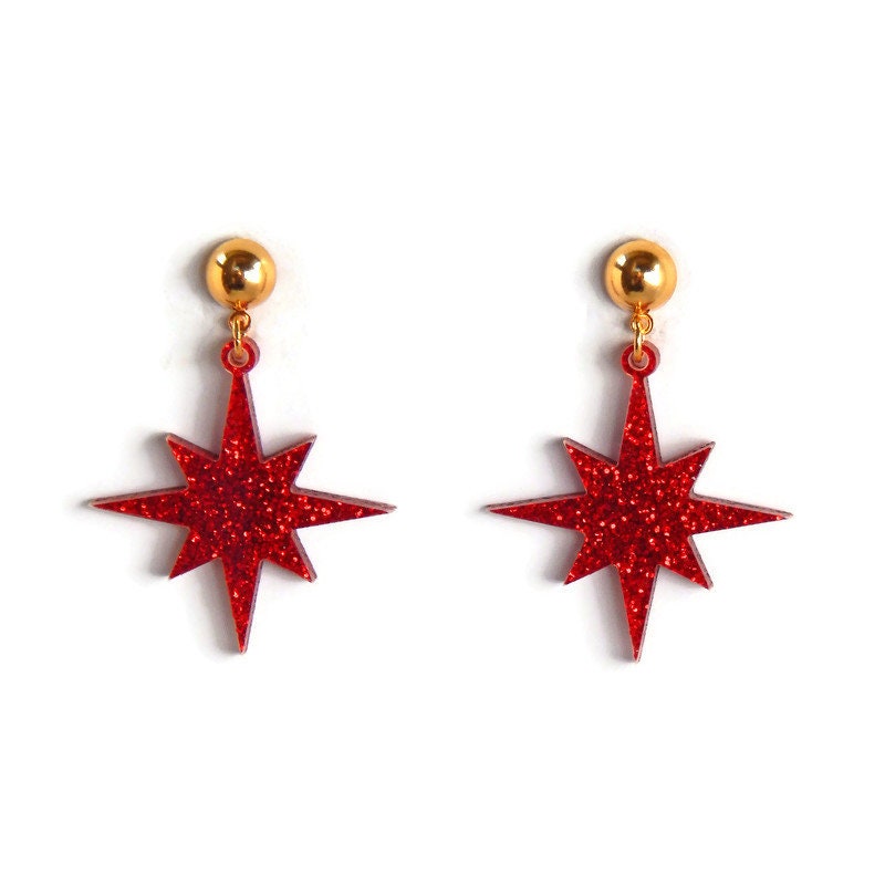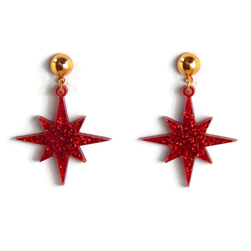 Flaunt your retro style with these 1950s inspired atomic starburst earrings. These mid century inspired star dangle earrings will add some vintage flair to any outfit, day or night. Made of red glitter acrylic sure to get attention. The laser cut design is so lightweight you will forget you are wearing them and hangs from your choice of a gold or silver tone half ball stud. The comfort clutch style earring backs keep the earring snug to your ear so they don't pull or droop.