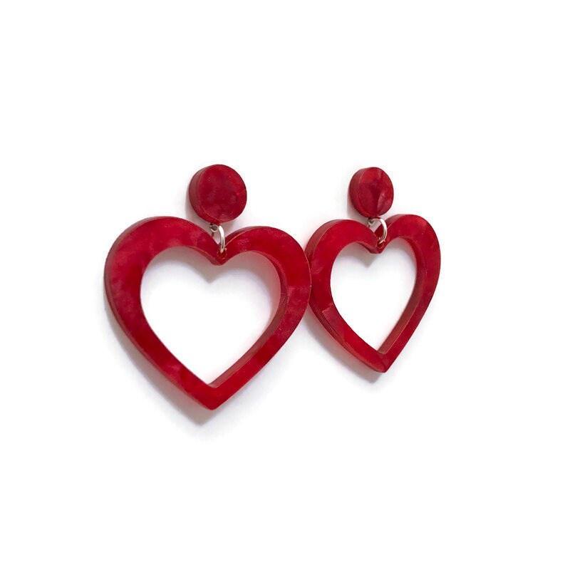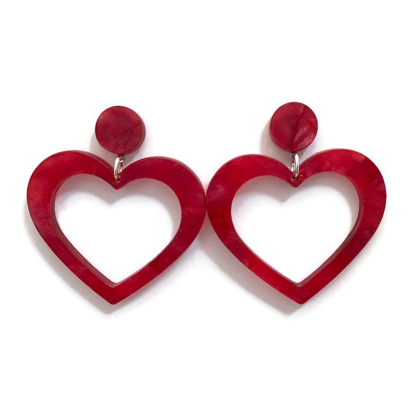 Share the love with these dangly heart cut out earrings. This fun and flirty design adds some unique style to any outfit, day or night. These earrings are made from laser cut acrylic so although large in size, they are light and comfortable on your ear. Red pearloid finish gives these earrings a vintage feel and unique finish.