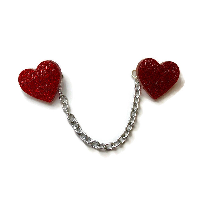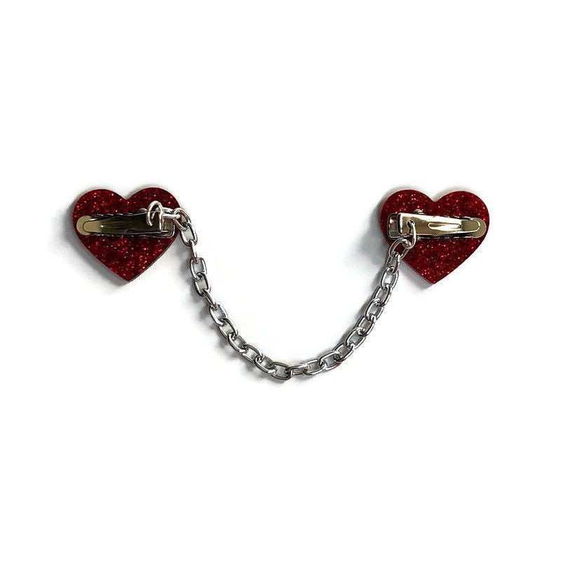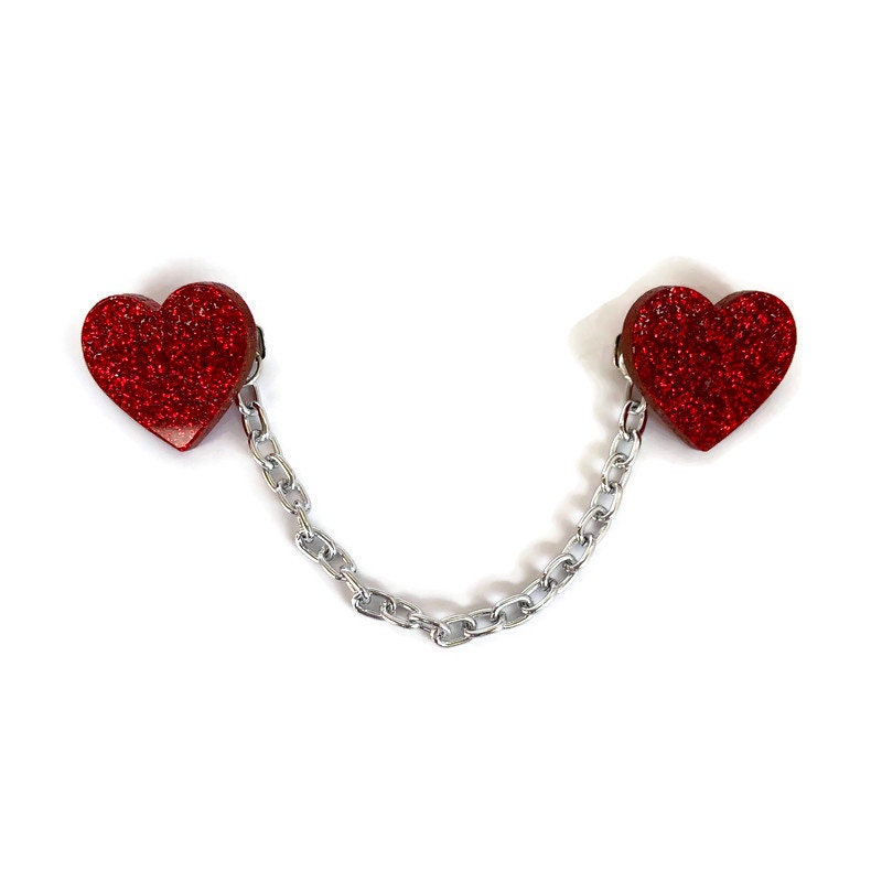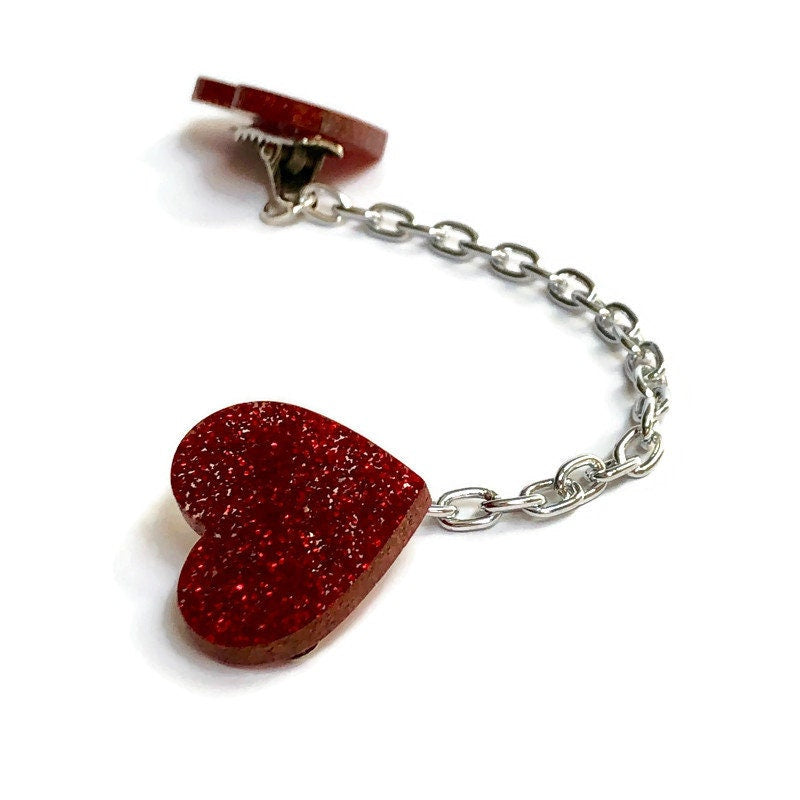 Add a little vintage love to your cardigan or sweater with this red glitter heart sweater clip. The hearts are laser cut from red glitter acrylic making them lightweight. The classic heart shape makes this sweater clip an everyday staple to your wardrobe. Each heart measures 23mm (about .90") tall by 27mm (1.06") wide and is affixed to an alligator style clip.