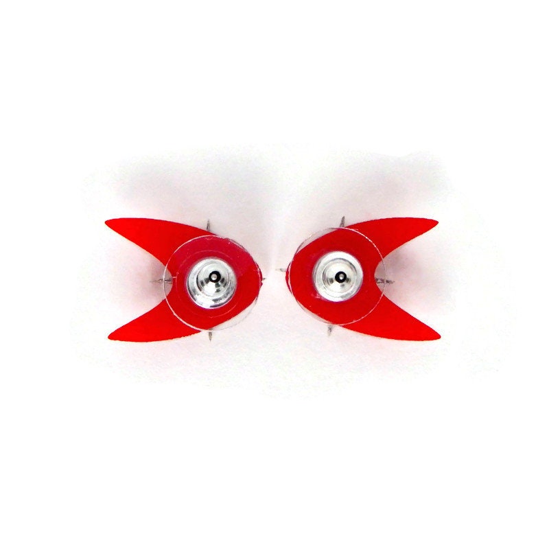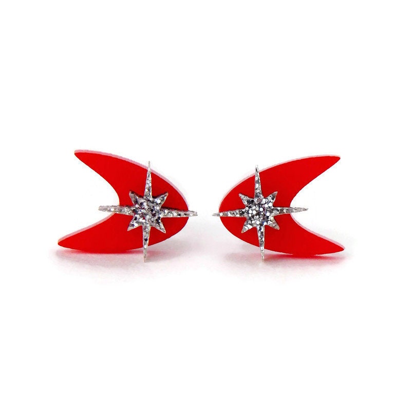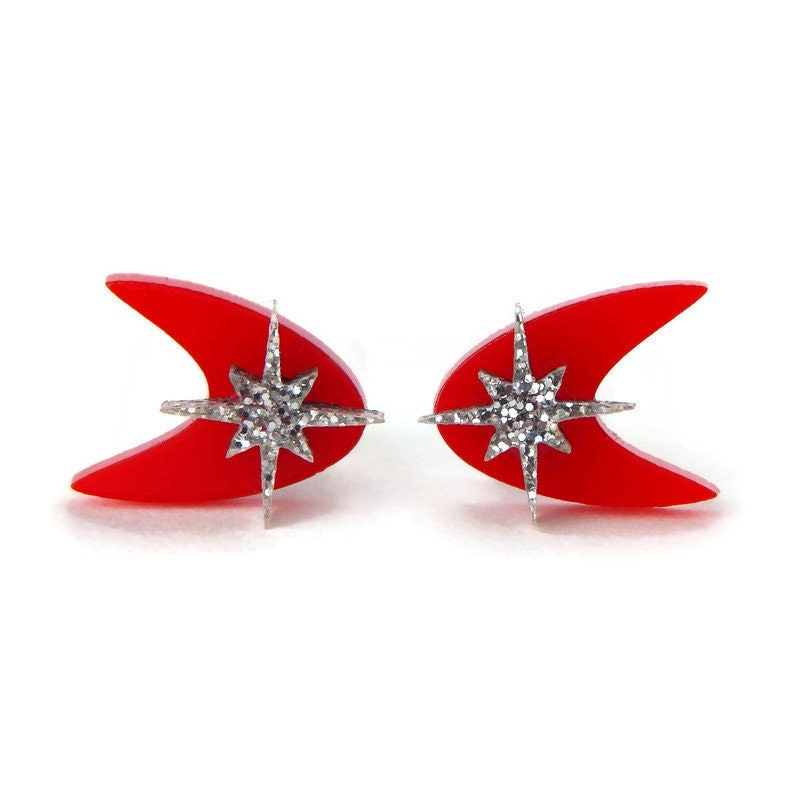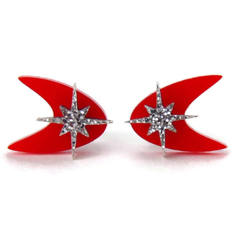 These red boomerang and silver starburst stud earrings are unique and retro. Laser cut from lightweight acrylic for maximum comfort and style without the added weight. This atomic 50s inspired design will add some vintage flair to any outfit, day or night. Laser cut from lightweight acrylic so they won't weigh you down. The red and silver glitter finish adds dimension and interest to these studs. Earring backs are nickel and lead free for sensitive ears.