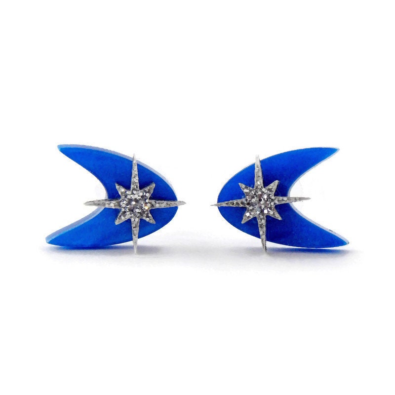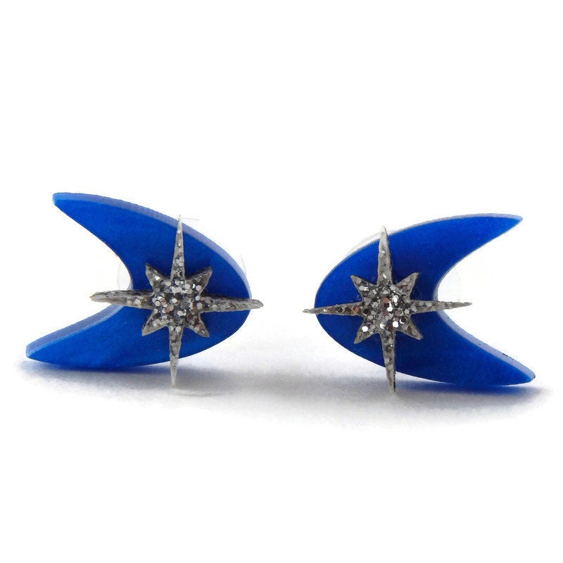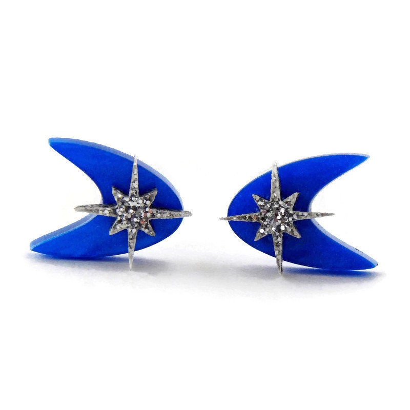 These blue boomerang and silver starburst stud earrings are unique and retro. Laser cut from lightweight acrylic for maximum comfort and style without the added weight. This atomic 50s inspired design will add some vintage flair to any outfit, day or night. Laser cut from lightweight acrylic so they won't weigh you down. The blue pearl and silver glitter finish adds dimension and interest to these studs. Earring backs are nickel and lead free for sensitive ears.
