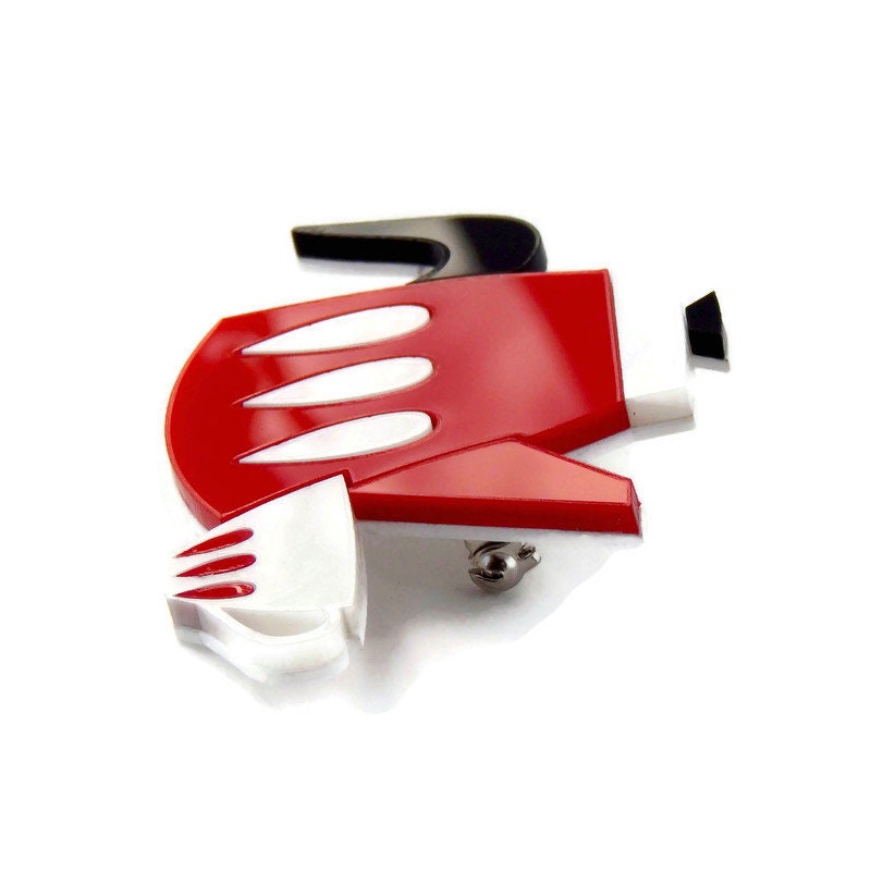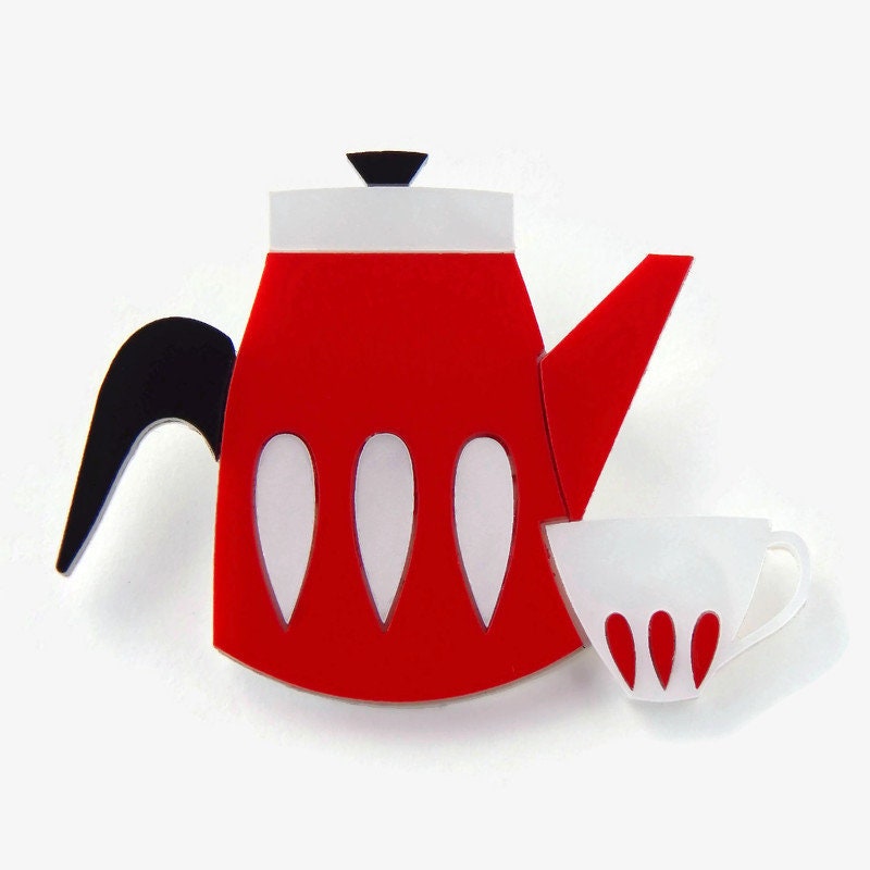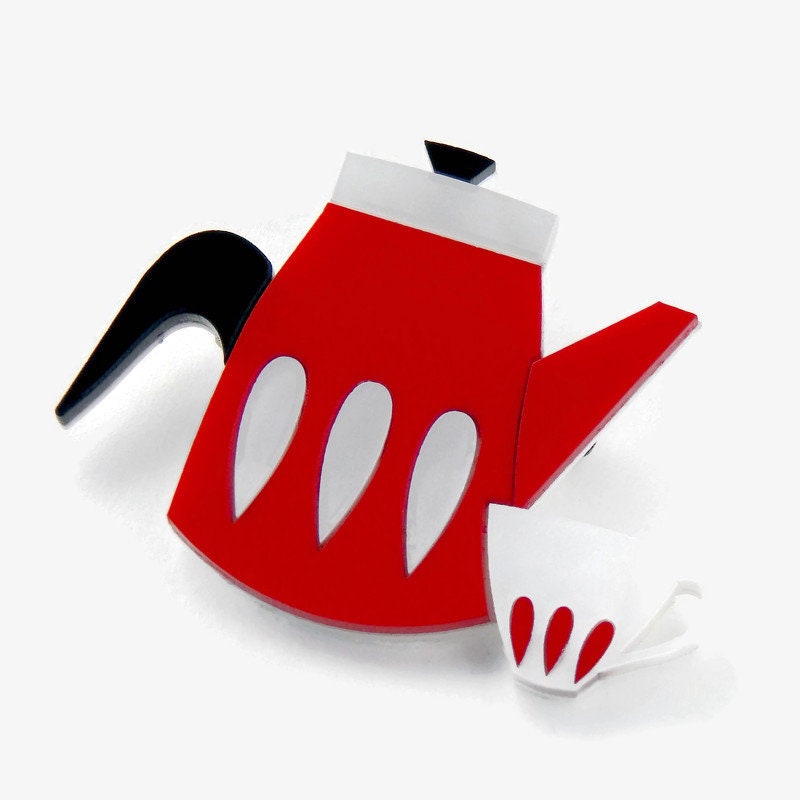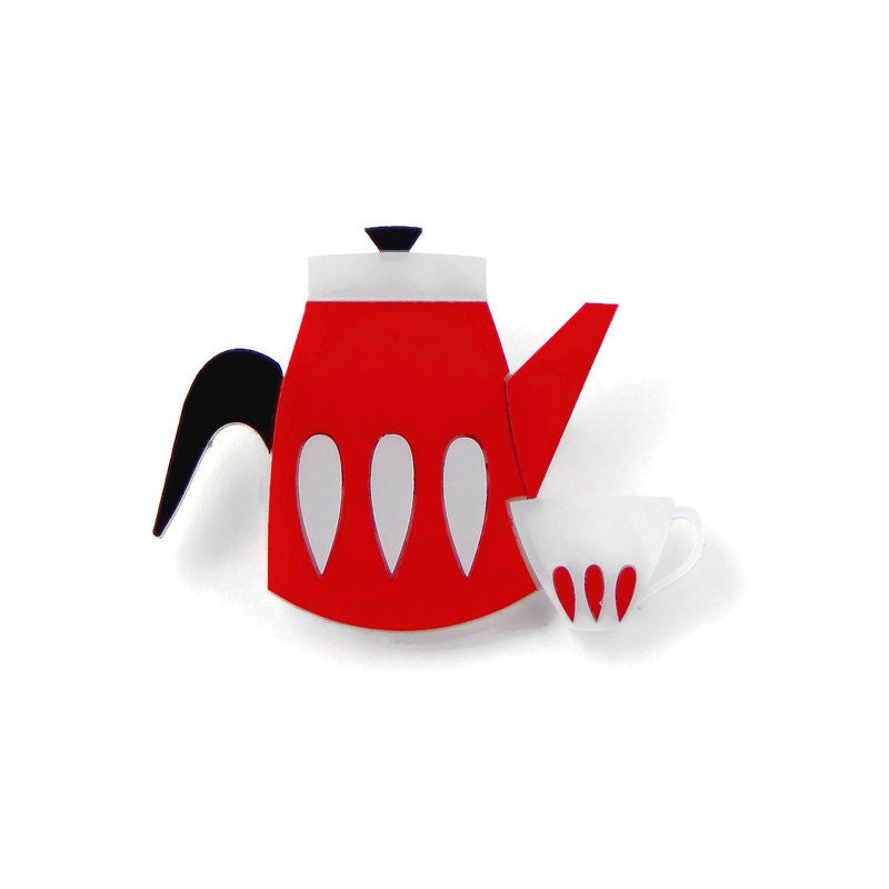 Add some vintage novelty to your wardrobe with this mid century modern coffee (or tea) pot brooch. The coffee pot is made of red acrylic with white pearl and black acrylic details and sits next to coordinating white pearl and red coffee cup. The brooch measures approximately 2 inches tall and 2.75 inches wide and is backed with a pin back.