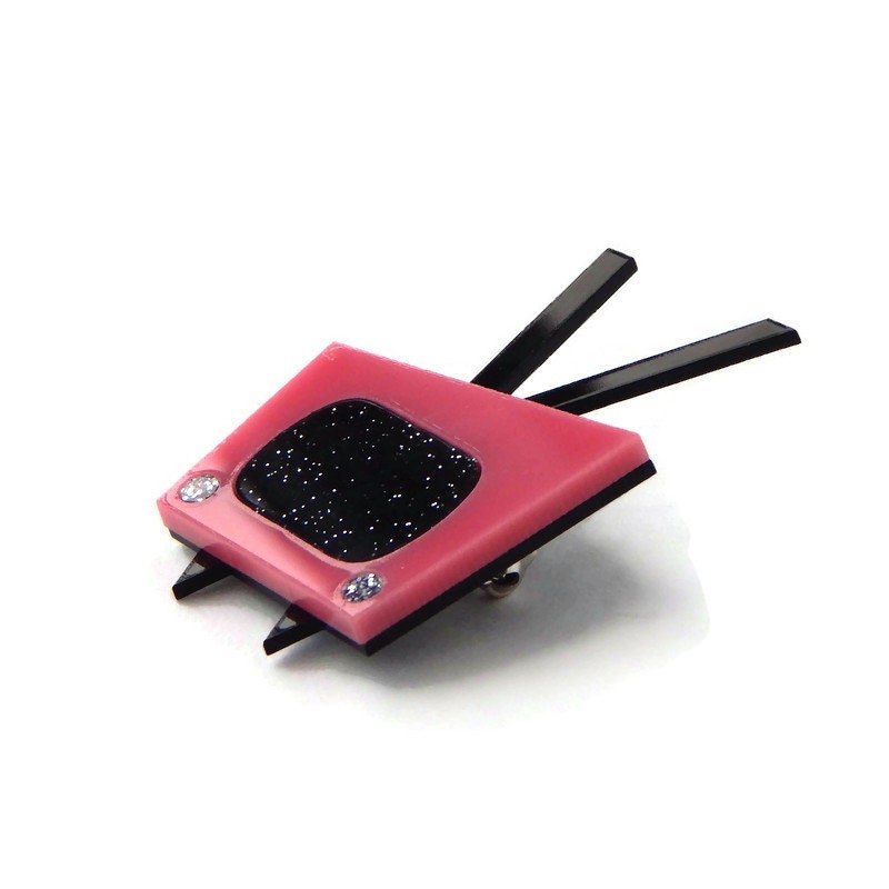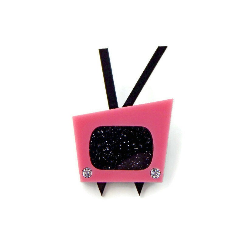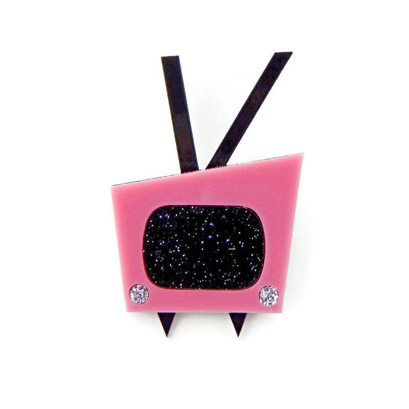 Inspired by Mid Century Modern design of the 50s and 60s this TV brooch is cute and fun. Laser cut pink acrylic surrounds a black and silver glitter acrylic TV screen and silver glitter TV dials. The brooch measures approximately 2 inches tall and 1.5 inches wide and is backed with a pin back.